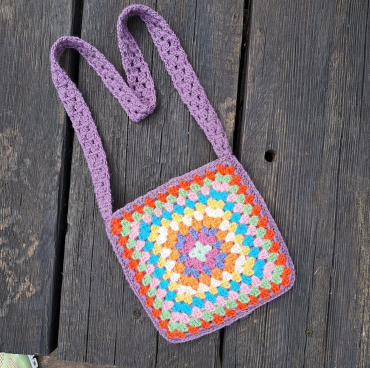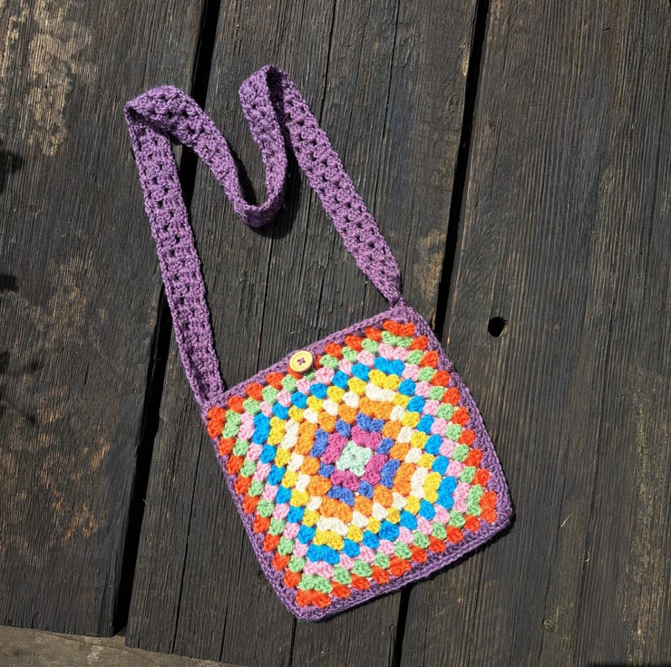 Purple/multi crocheted side bag with button detail and strap - 8.5inch/21cm square with strap size - 40inch/101cm - cotton/acrylic mix and fully lined.