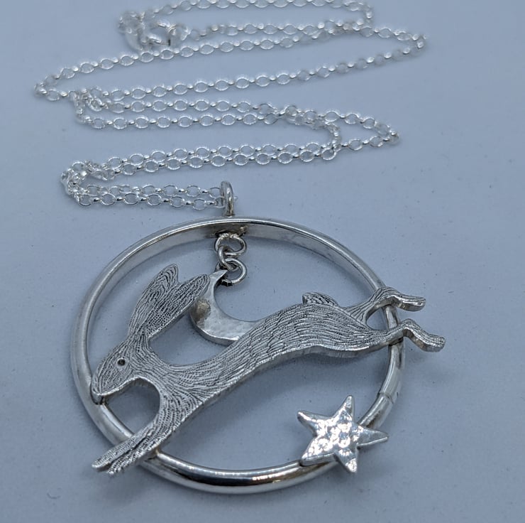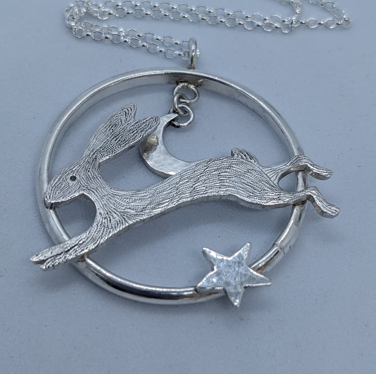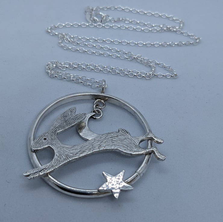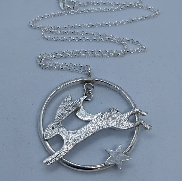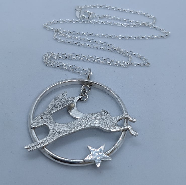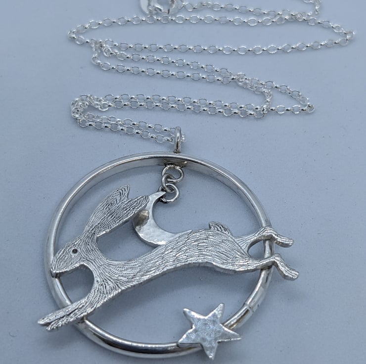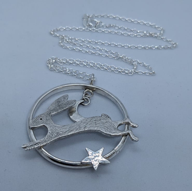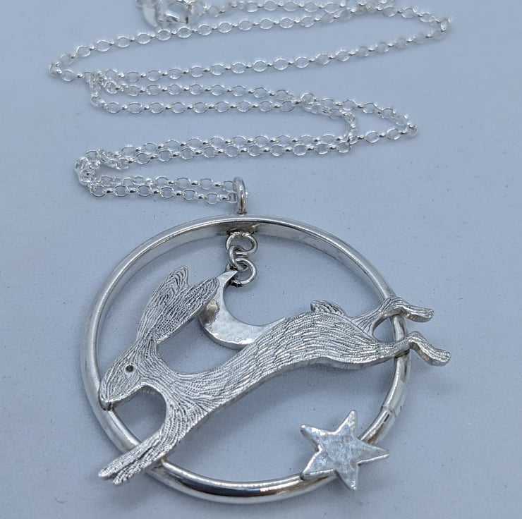 This sterling silver pendant features a speedy, engraved, sterling silver hare running across a handmade ring. A hammered sterling silver crescent moon hangs above him and a hand saw pierced, hammered star also embellishes the ring. The pendant is suspended from an 18 inch, 1.7mm sterling silver belcher chain and is hallmarked. It would make a beautiful gift.
