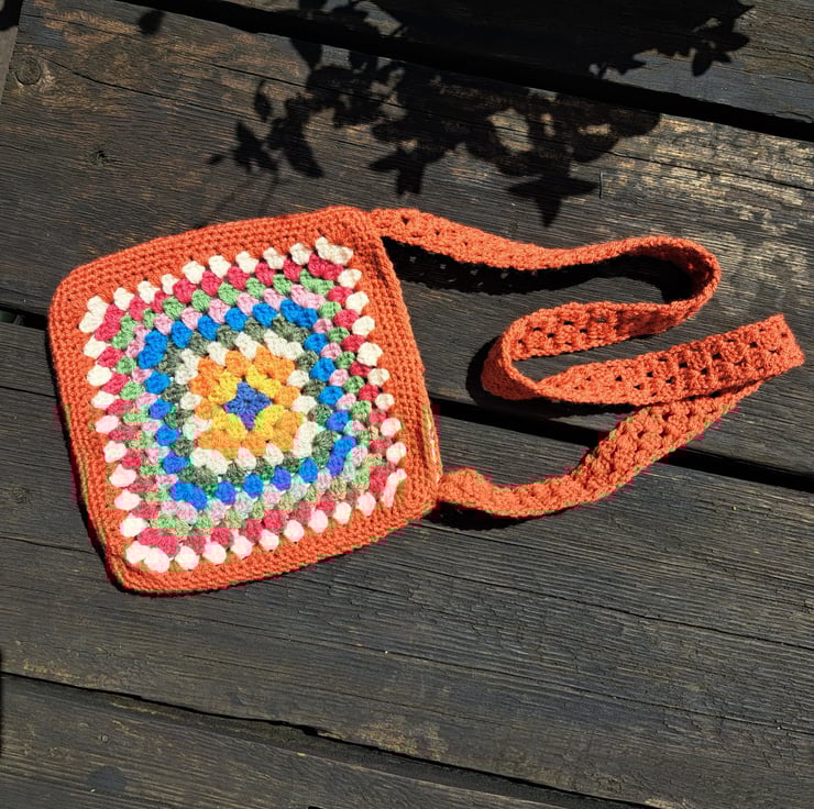 Terracotta/multi crochet bag with button detailing and fully lined - L 9.5 inch/24cm square - strap length - 43inch/109cm - cotton/acrylic mix.