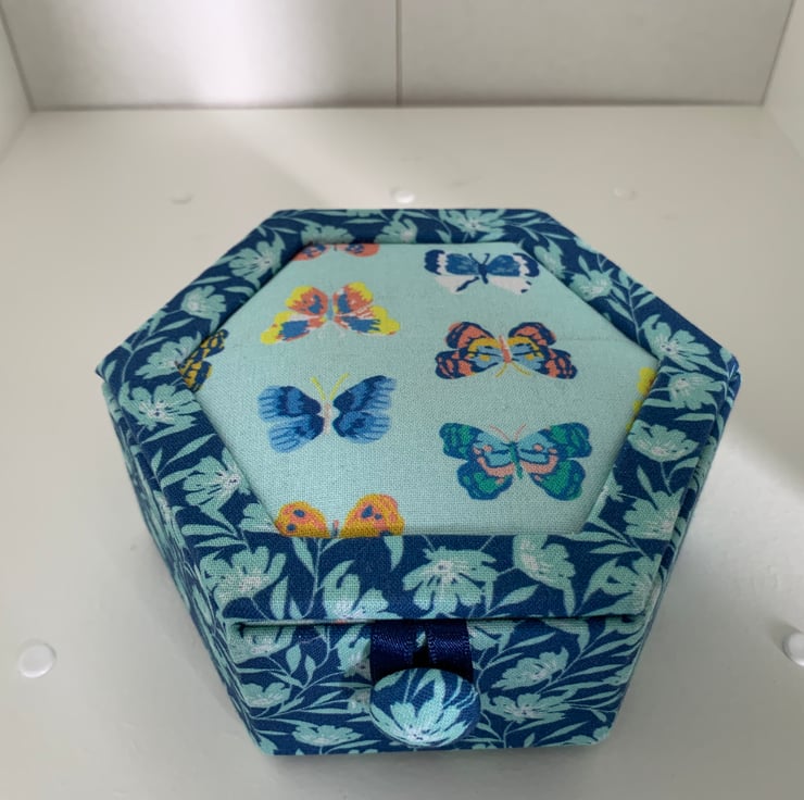 A handmade hexagonal box suitable for jewellery or other keepsake items. All pieces are individually hand cut, fabric covered and assembled.