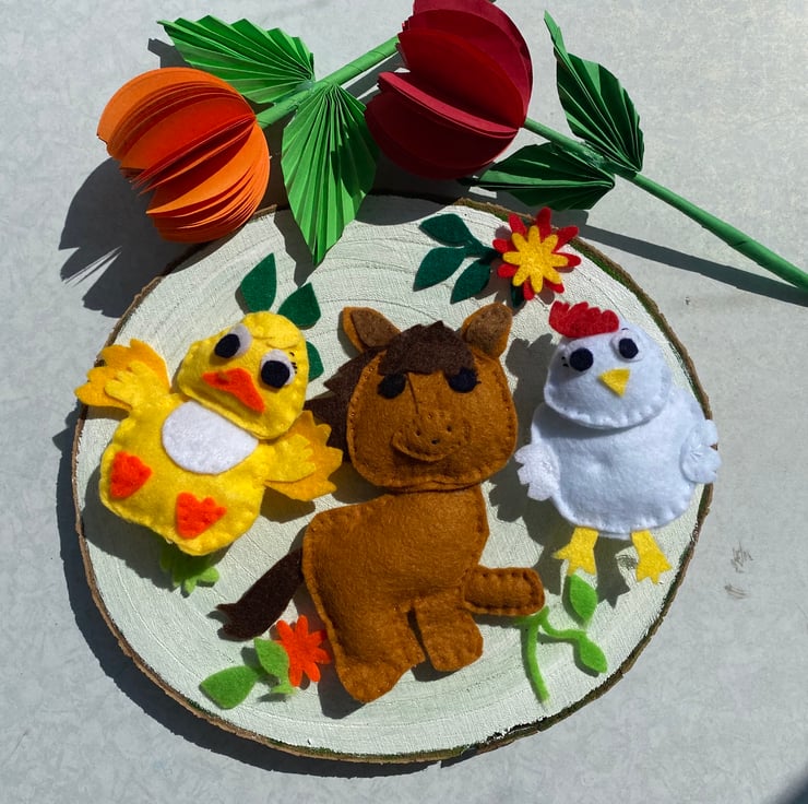 Cute Farmyard felt animals, sitting on large wood slice. Ideal playroom wall decoration.