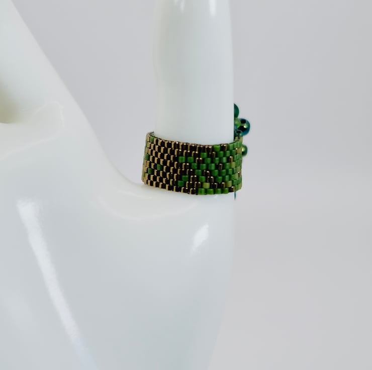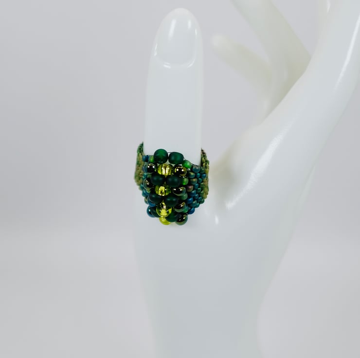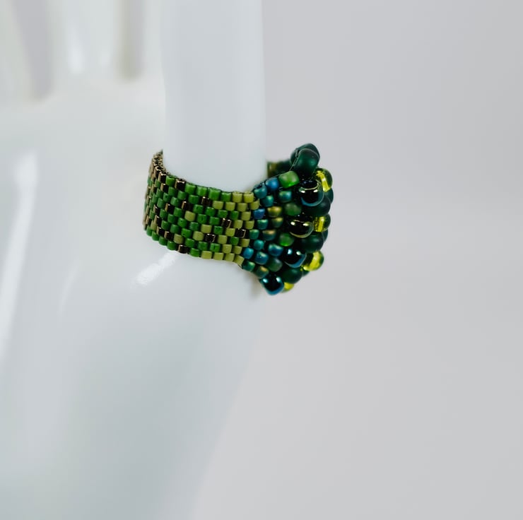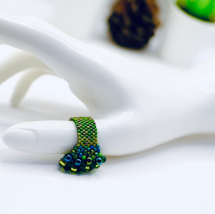 A unusual beaded ring for lovers of all things dragons and snakes. Matt green Japanese Delica beads form the shaft of this ring, then merge into gradually larger metallic green and teal Toho beads, finally forming a spine of crystalline lime green beads.