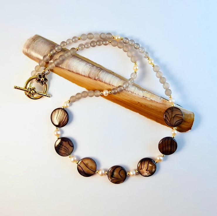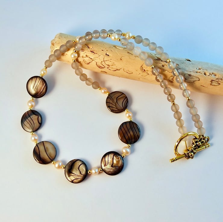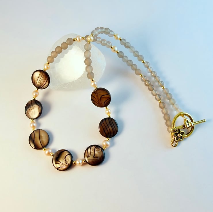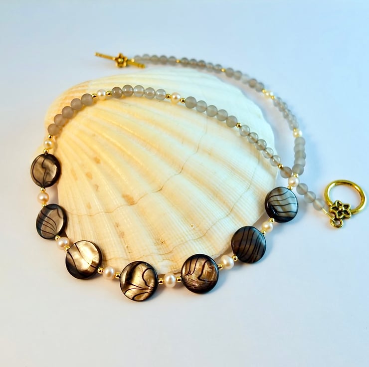 The coin shell beads are a soft grey with lines of darker charcoal, with a lovely, iridescent sheen in the light.