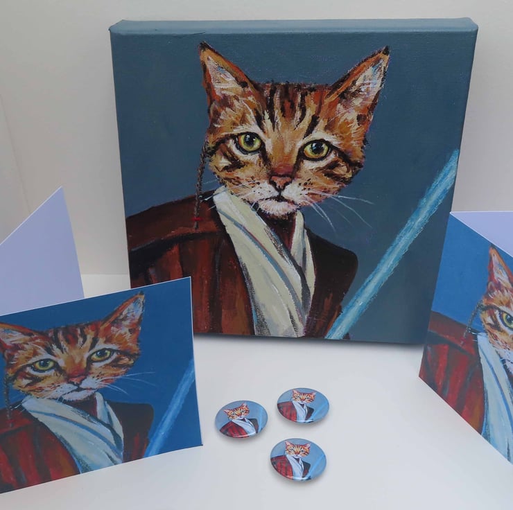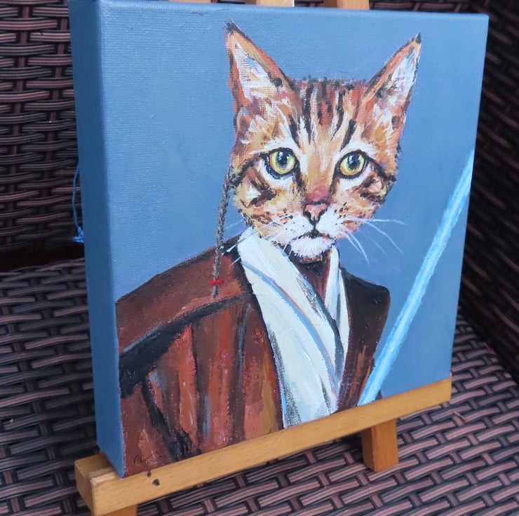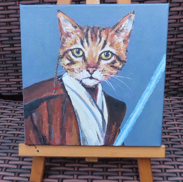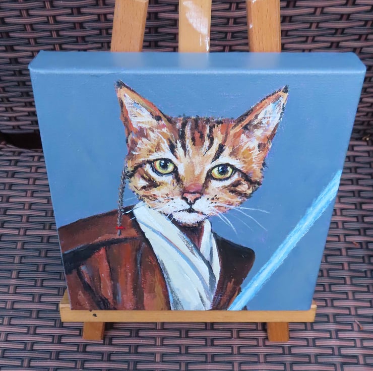 Original acrylic painting on canvas of a tabby cat in his jedi costume complete with light sabre!