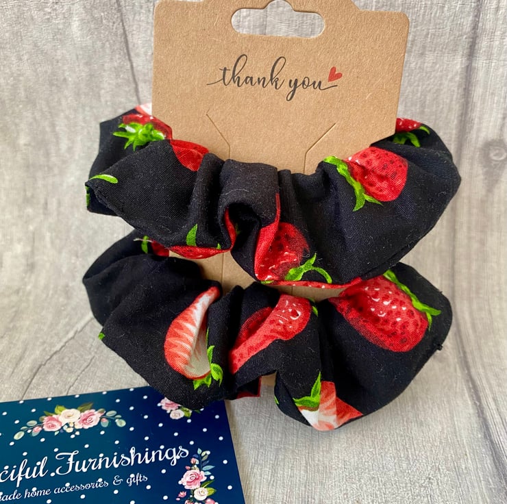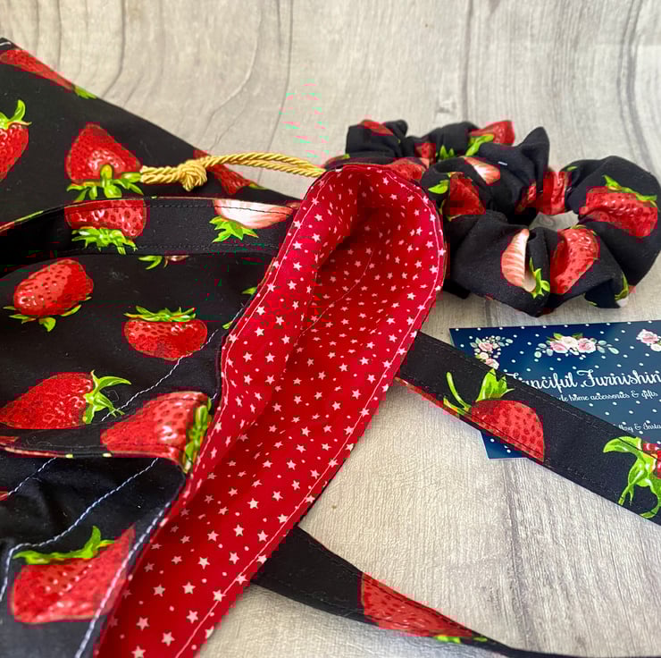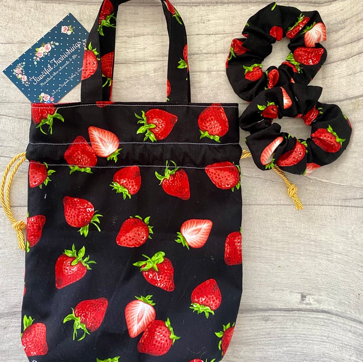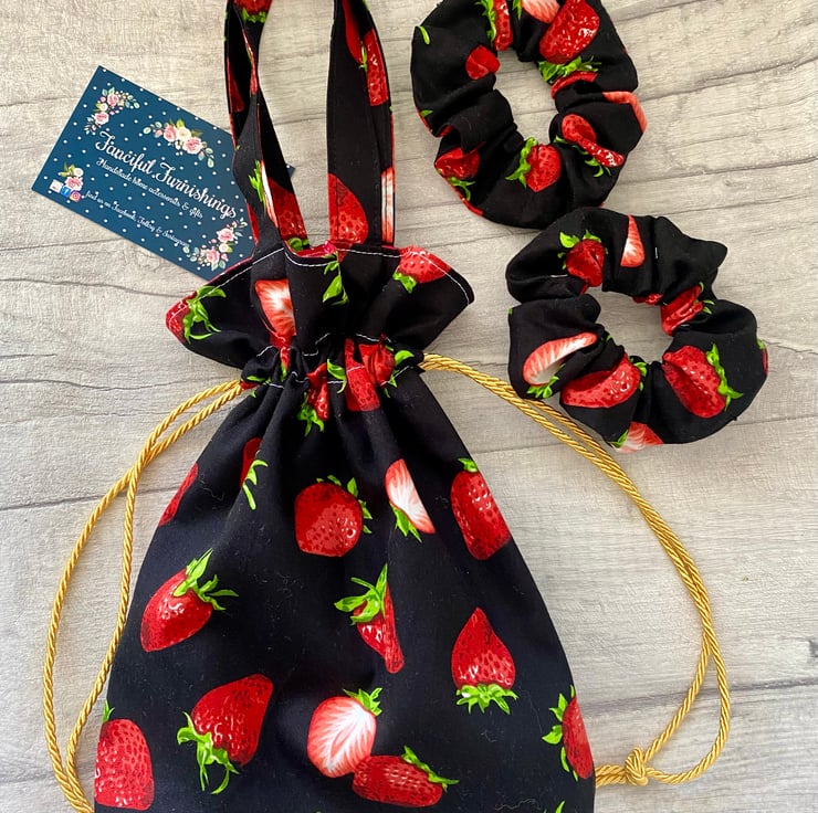Beautiful girls dolly style bag with two matching scrunchies. The bag measures approximately 10 x 8” (excluding the handles), it’s fully lined and finished with a gold coloured tie cord which works sets off the print on the fabric. This would make a beautiful gift for a young lady. I have lots of other beautiful fabrics available on request.