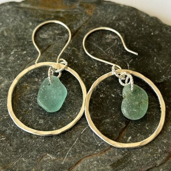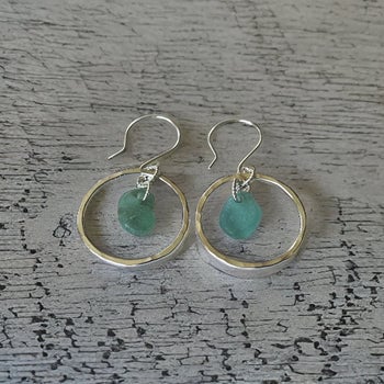 Handmade eco-friendly recycled sterling silver hoop earrings, featuring authentic ocean beach sea glass. These unique bohemian style hoops are crafted with a hammered finish. Suspended from sterling silver wires.