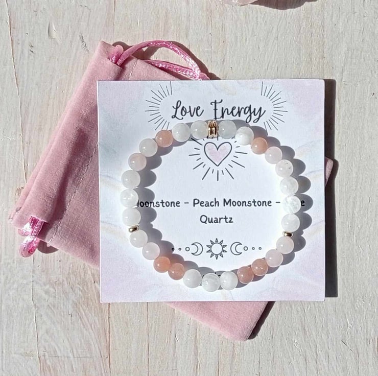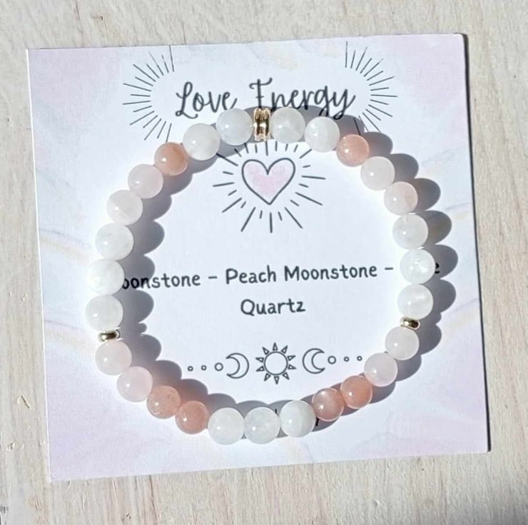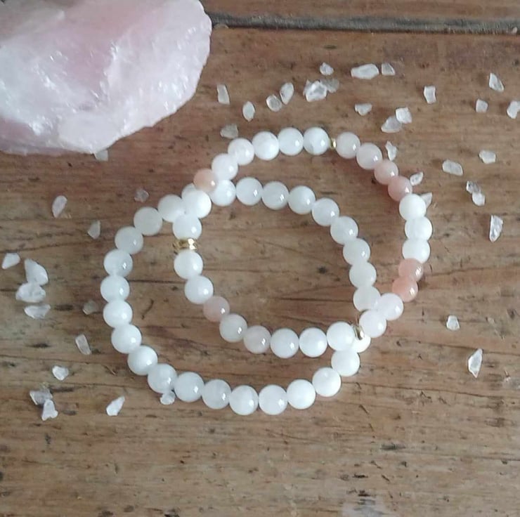 Rainbow & White Moonstone, Peach Moonstone, Rose Quartz.