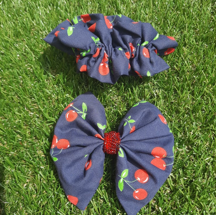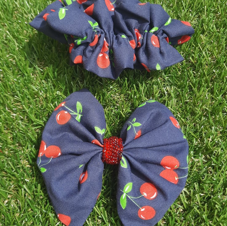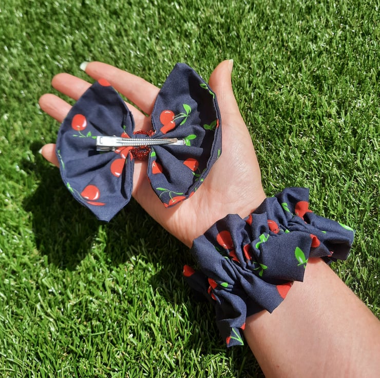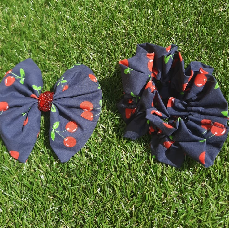 They come as a matching pair. The bow has a red seed bead centre and a chrome clip / slide.