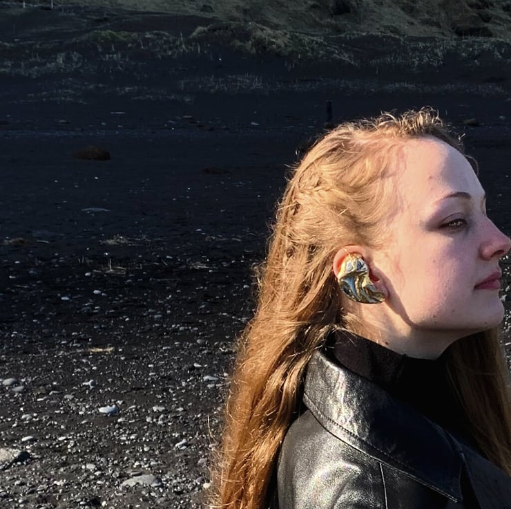 The statement earring is held in place by a classic earring post with butterfly back at the bottom, and an adjustable hook at the top. Wearing it only requires one regular ear piercing, and the top hook can be altered to fit different sized ears. This structure facilitates comfortable and practical wearing that suits a wide range of wearers.