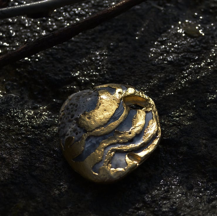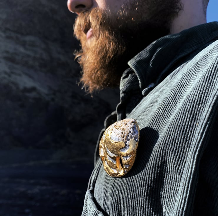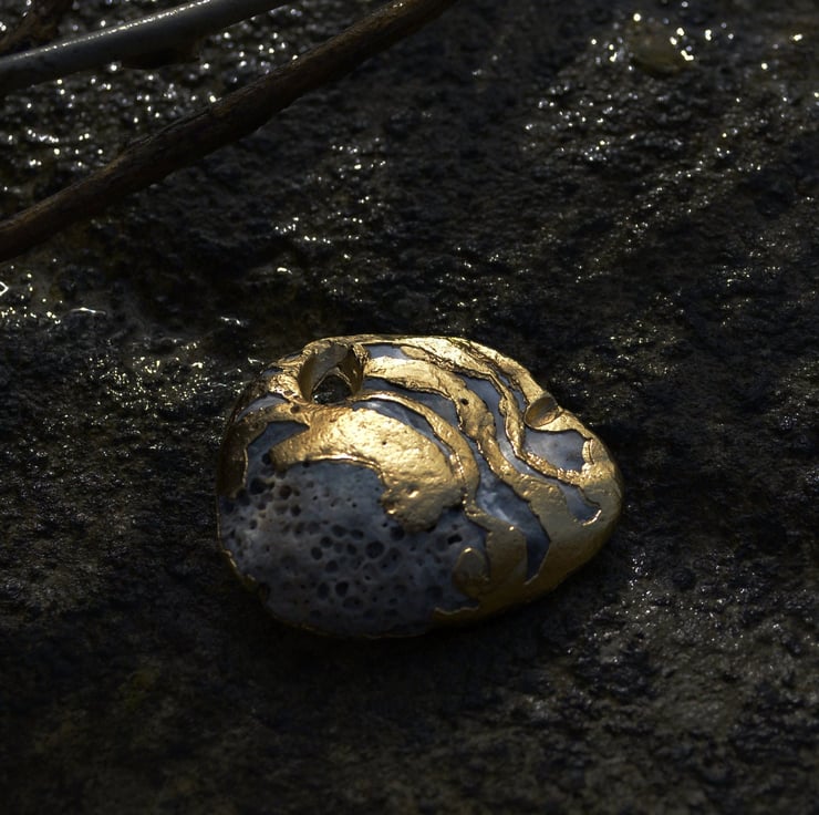 This piece has been carefully handcrafted by myself in England, using a rock collected by me from the English seaside and then fitted with a sterling silver brooch back, before electroforming in pure silver. The electroforming process is a modern technology that encases objects inside metal by depositing it atom by atom using electrical current. I intentionally covered certain areas of the brooch with pure silver to protect the stone from damage and make it an extremely durable jewellery piece, while also leaving other areas uncovered to reveal the organic beauty underneath. I finished off with a layer of 24k gold plat