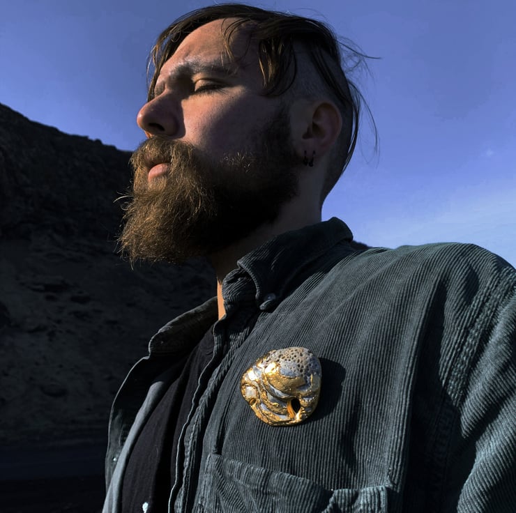 Natural marine rock electroformed in pure silver, with sterling silver brooch back and 24k yellow gold plating.