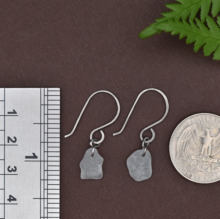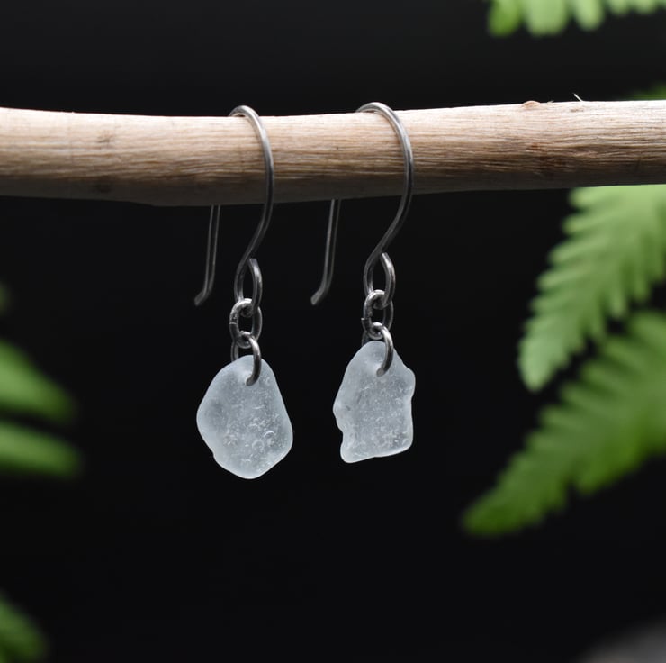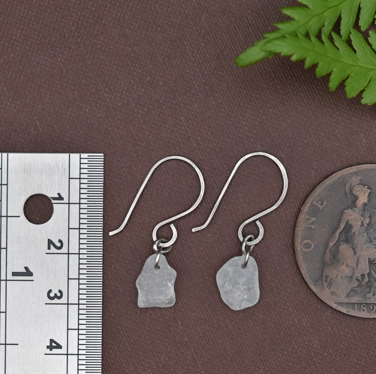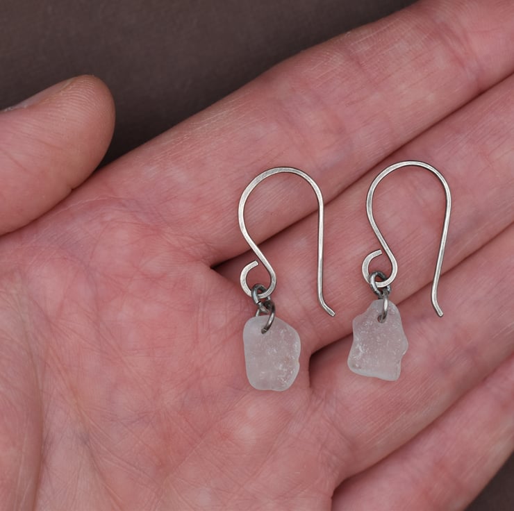 These minimalist little earrings each feature a small piece of white sea glass collected from a local Highland beach, and handmade hooks and jump rings in sterling silver 925. They measure just over 3cm from the top of the hook, and have a 'dangle length' (from the bottom of the hook) of around 1.5cm. The silver components have been finished with a patina using liver of sulphur. These earrings are just the right size for everyday wear!