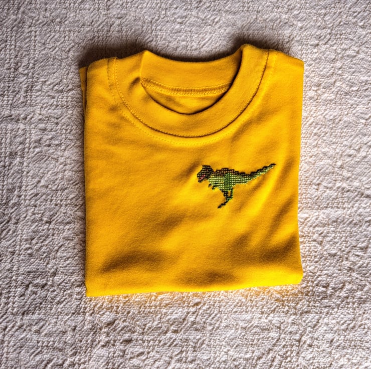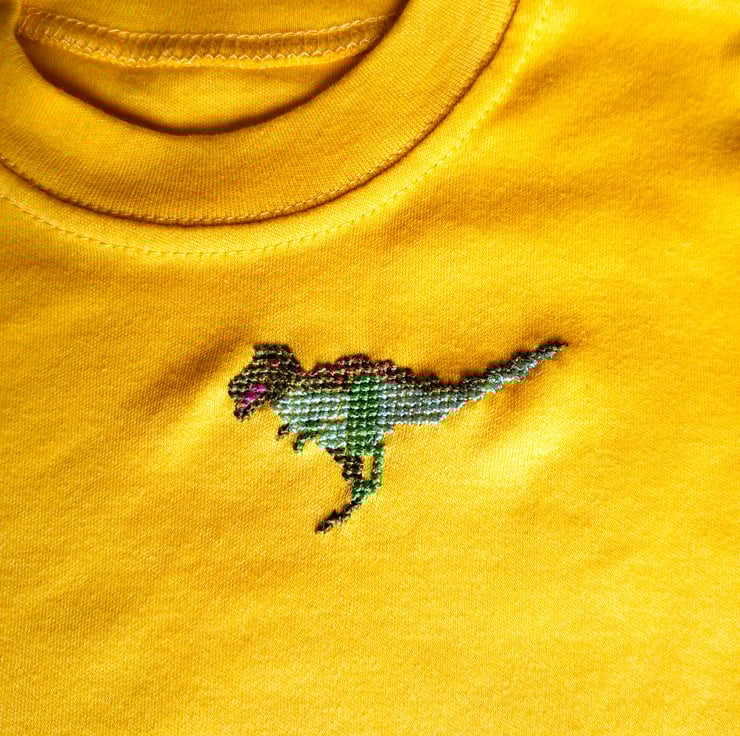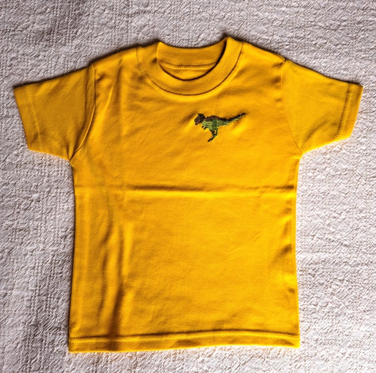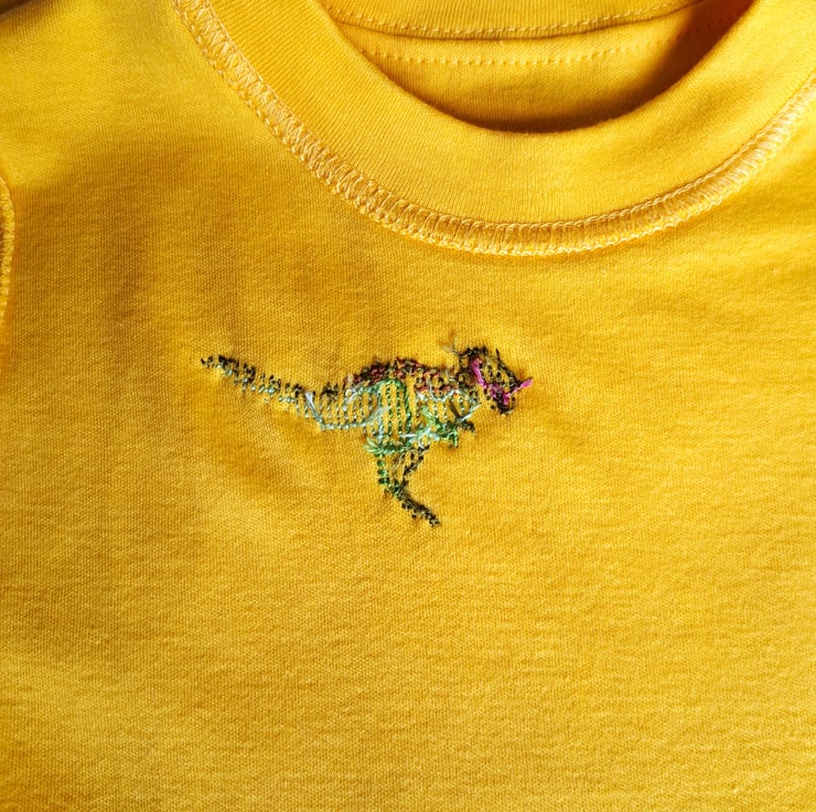 On this lovely soft golden yellow T-shirt I have hand embroidered a running tyrannosaurus in various shades of green. As I never use a permanent backing material when embroidering kids' clothing, there is nothing inside the shirt to irritate your child's skin. The shirt has short sleeves and a round neck. It is all cotton and can be machine washed.