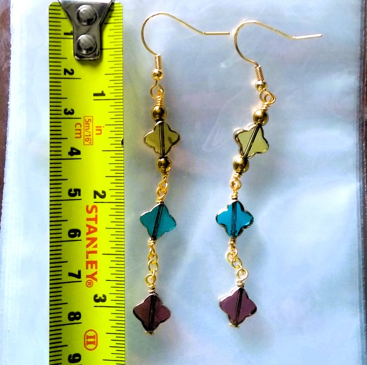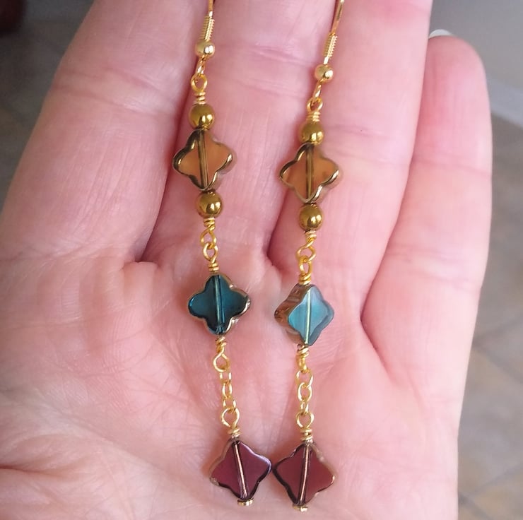Beautiful, lightweight, multi coloured glass 4 leaf clover design bead, long drop earrings. Finished with gold plated ear wires and chain and two 4mm antique gold hematite gemstone beads.
