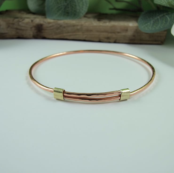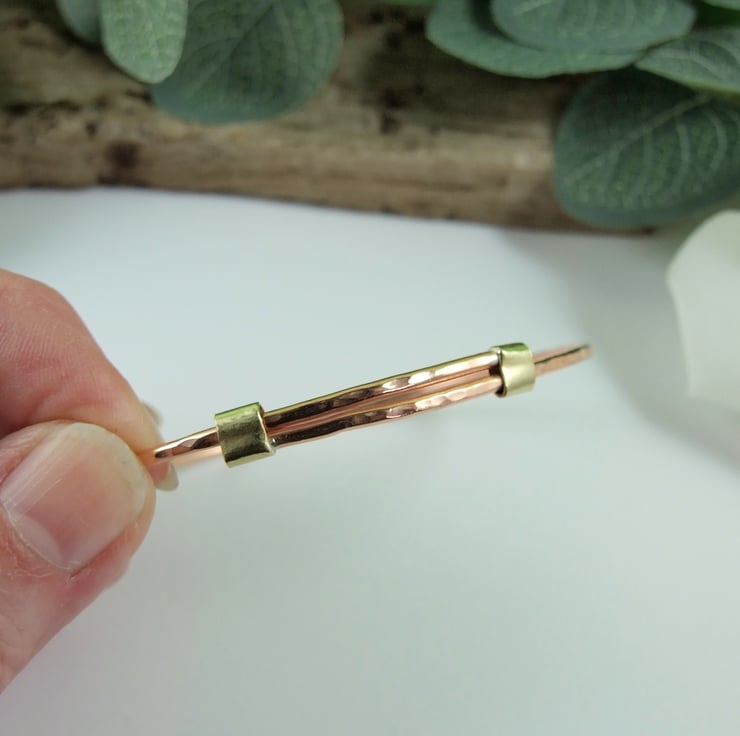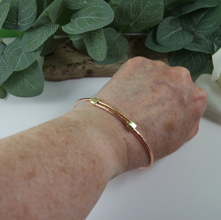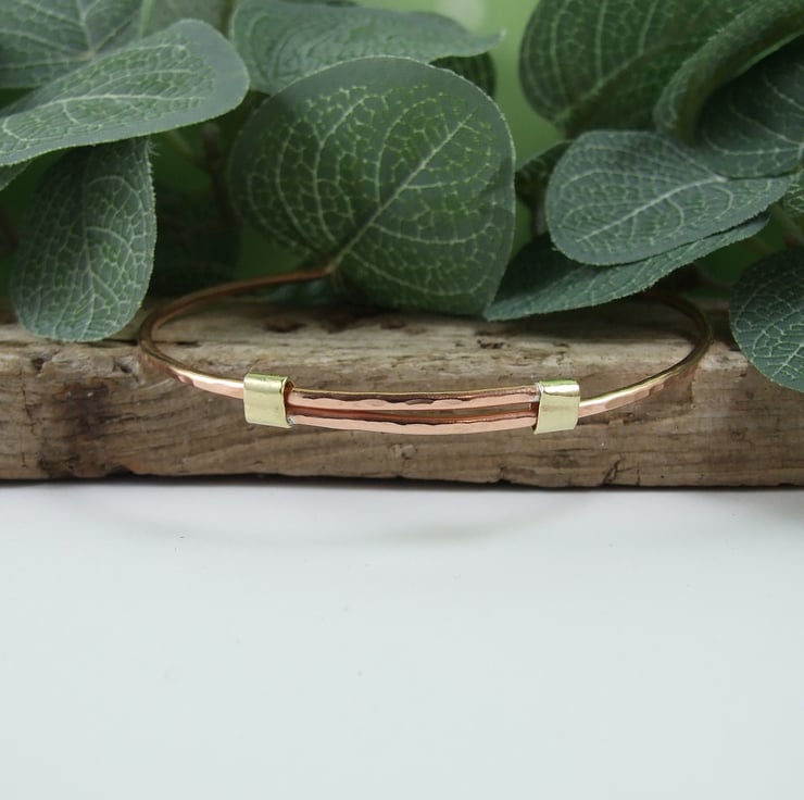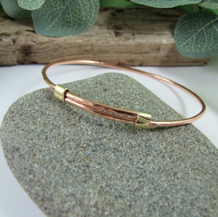 I have made the bangle from 2mm wide pure copper wire, hammered for texture and then solderd in place two brass sliders overlapping to create an adjustable fit and given it an polished finish.