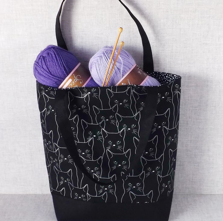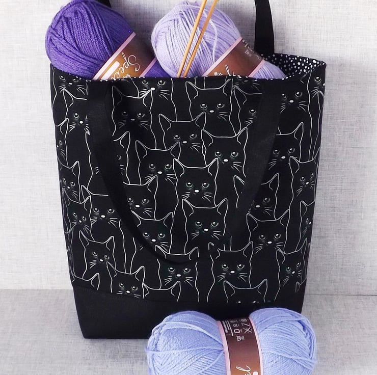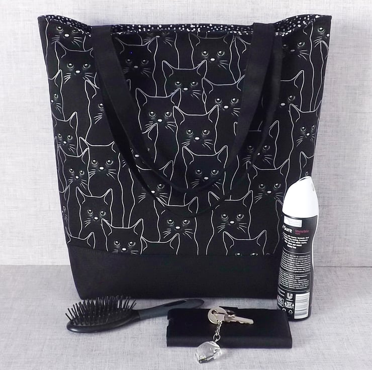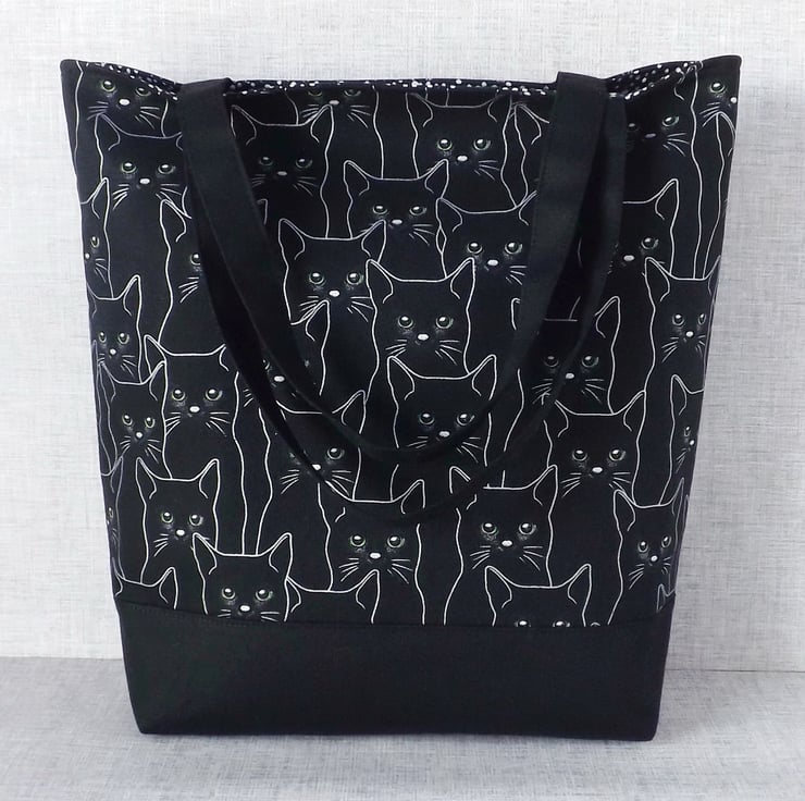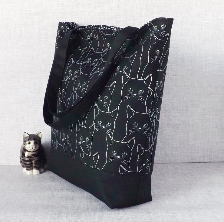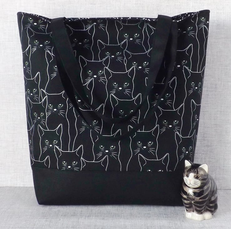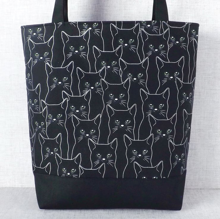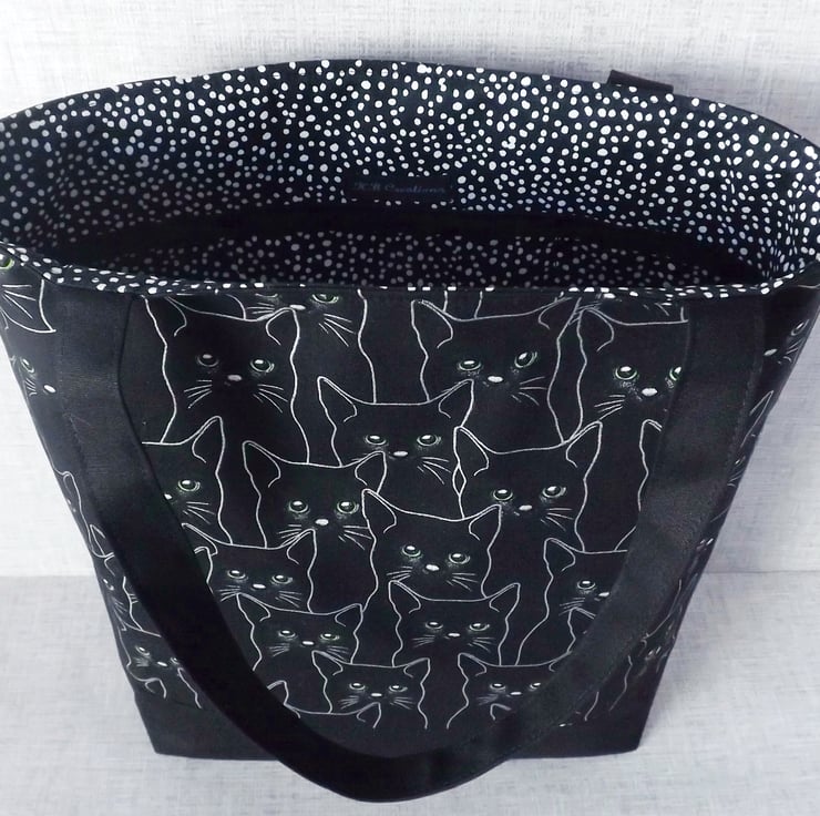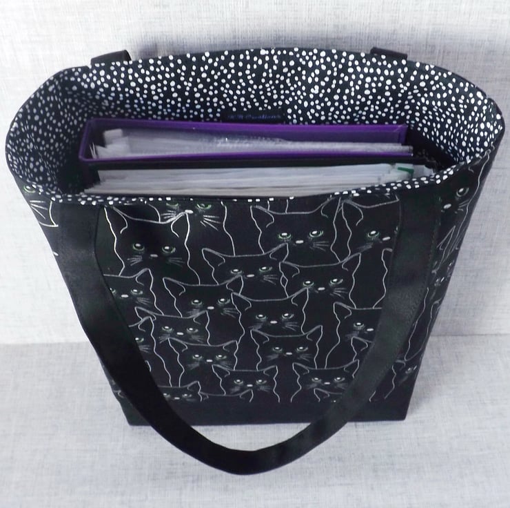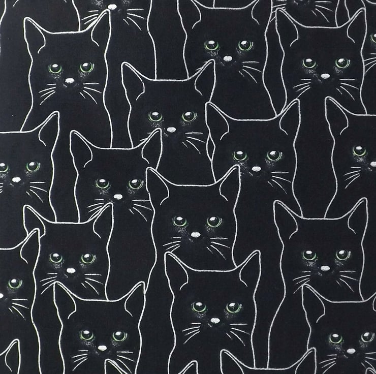 The main fabric has a design of black cats, outlined in silver & with green eyes, on a black background. I have combined this with a black canvas fabric.