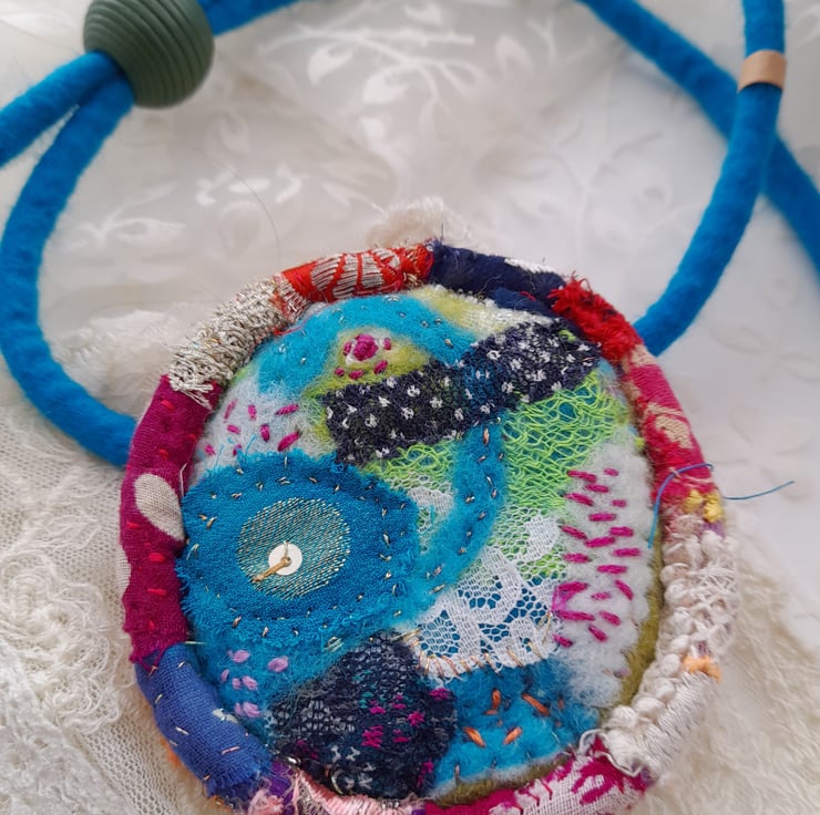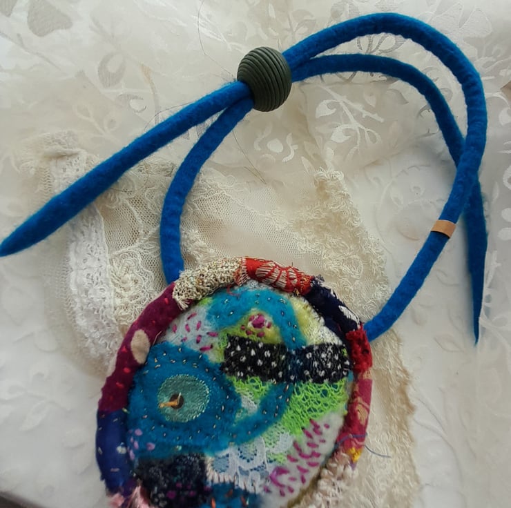 This necklace is made using vintage textiles hand stitched onto a needle felted felted base to give it strength.it has a red and blue felted cord which I made to compliment the colours in the piece and is approximately 23 inch all the way around. The centre piece measures roughly 3.5 x 3 inch. The necklace has a vintage bead and can be adjusted.