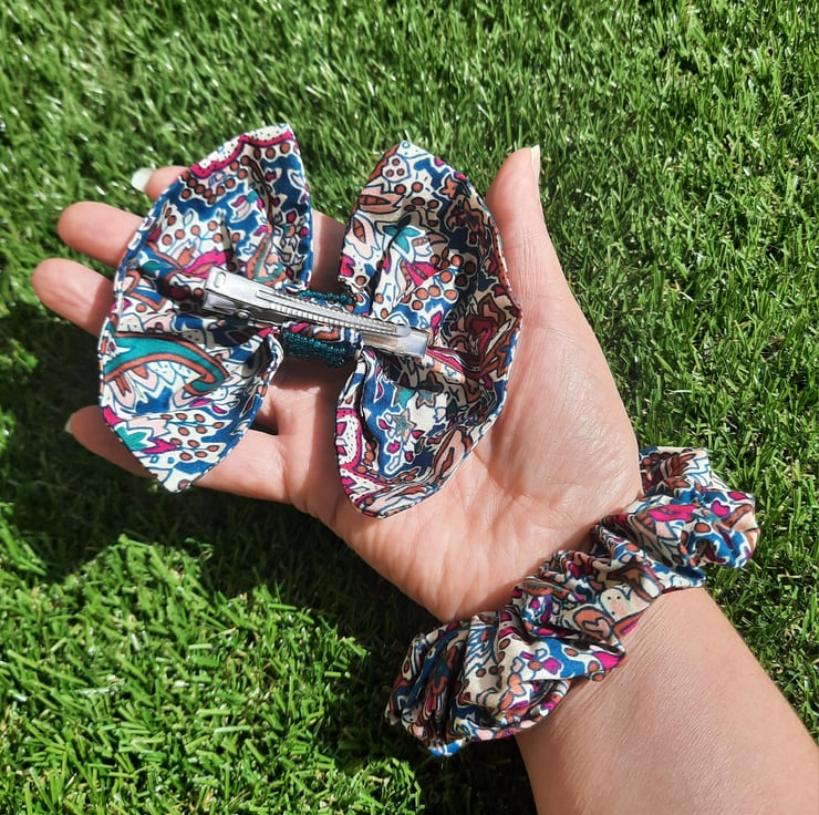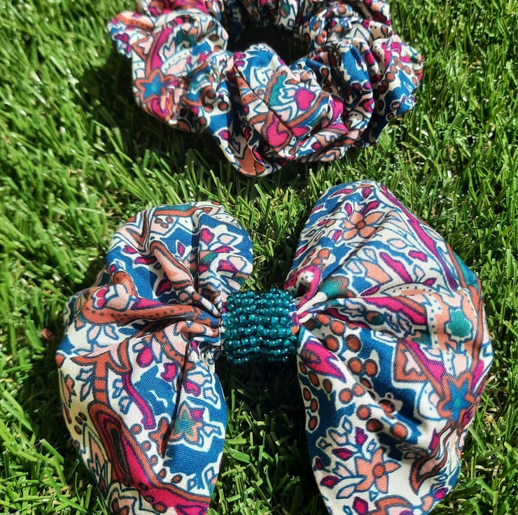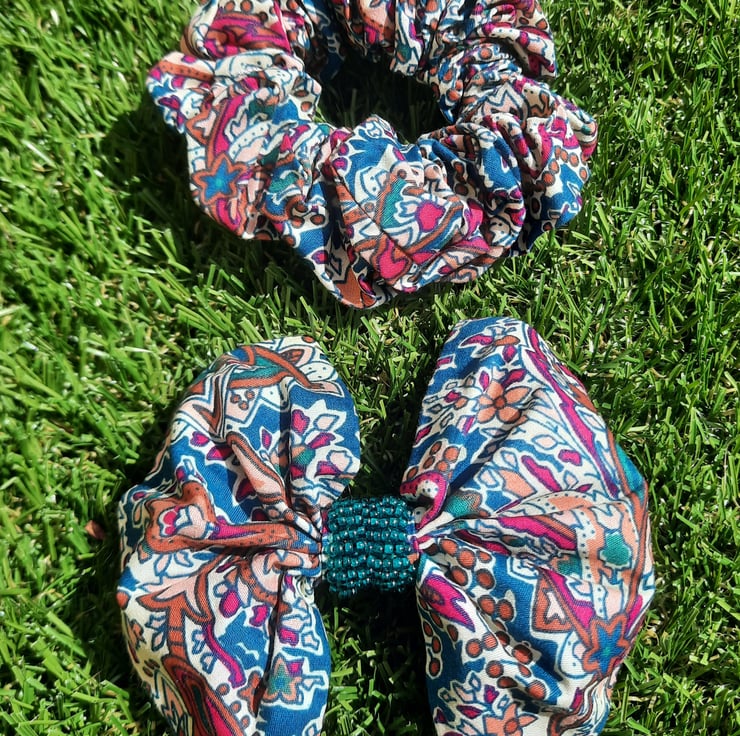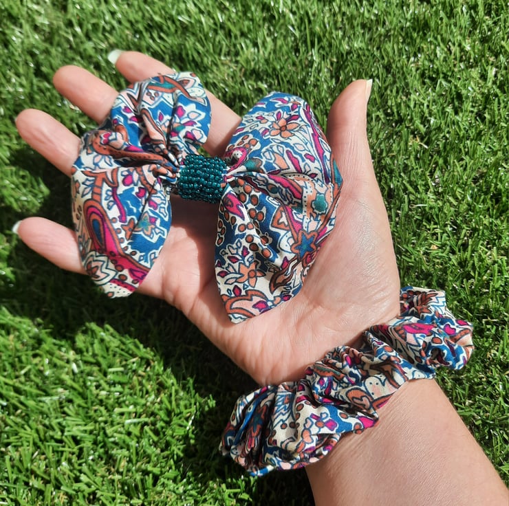 Both are made from a teal, raspberry pink and cream pattern fabric. The bow has teal seed bead detail.