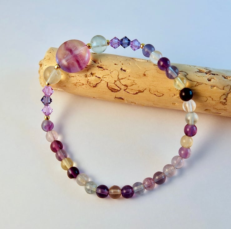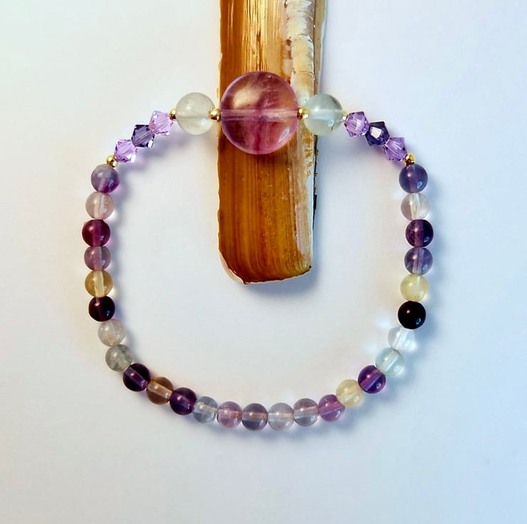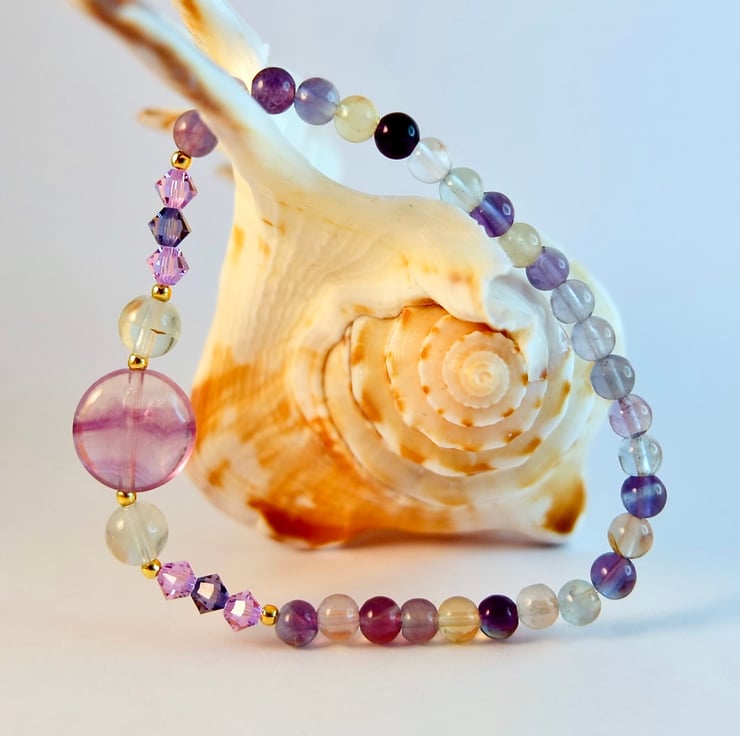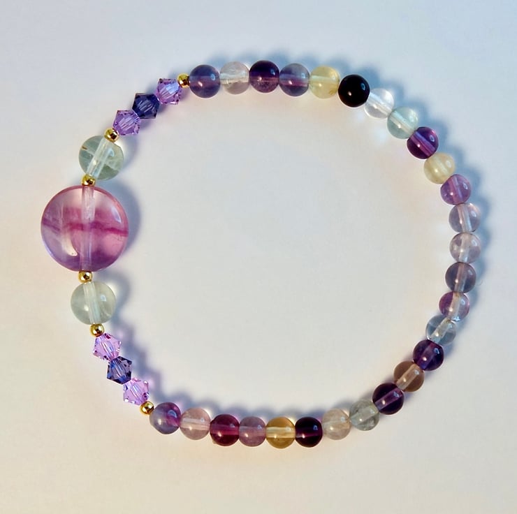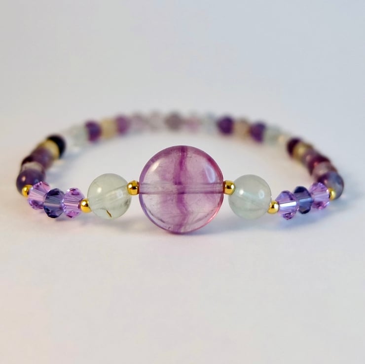 Purple and green sparkly Fluorite gemstone bracelet featuring a central 12mm lilac Fluorite disc bracketed by 6mm mint green Fluorite and trios of 4mm sparkly Austrian crystal bicones in the colours 'violet' and 'tanzanite'.