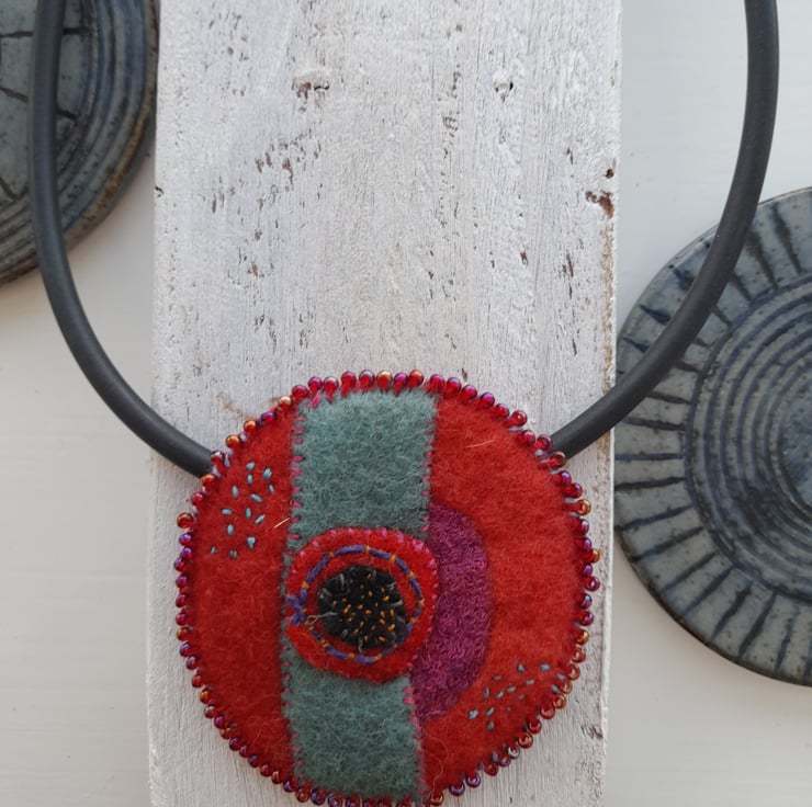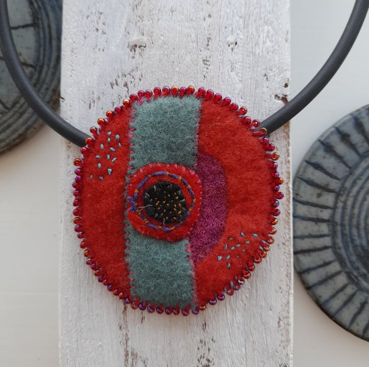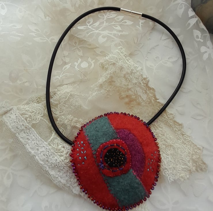 This necklace is made using a variety of felting techniques along with some small pieces of textiles with hand stitching and little beads.