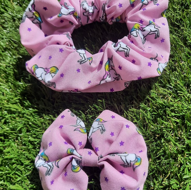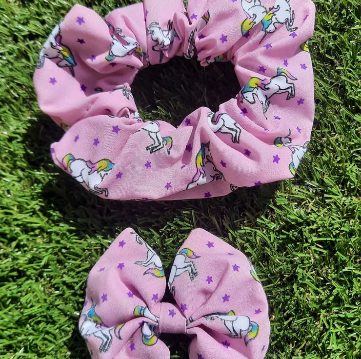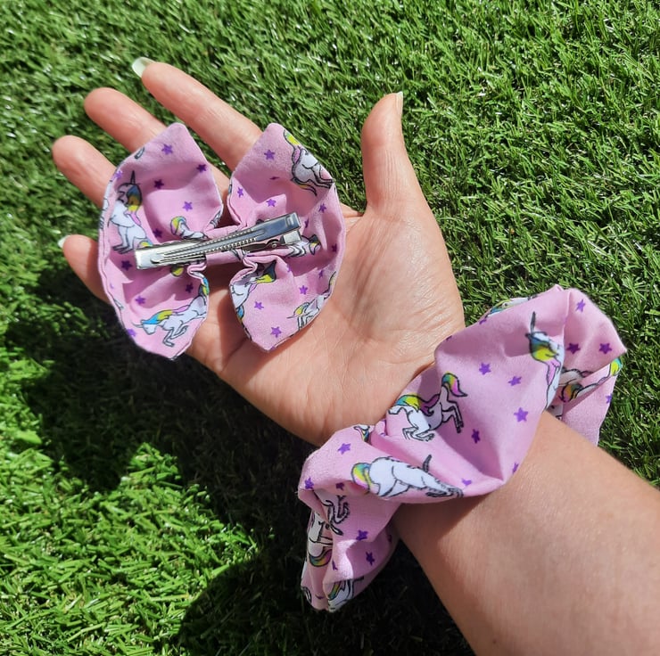 The set includes a clip on bow and a scrunchie made in a pink unicorn printed cotton fabric.