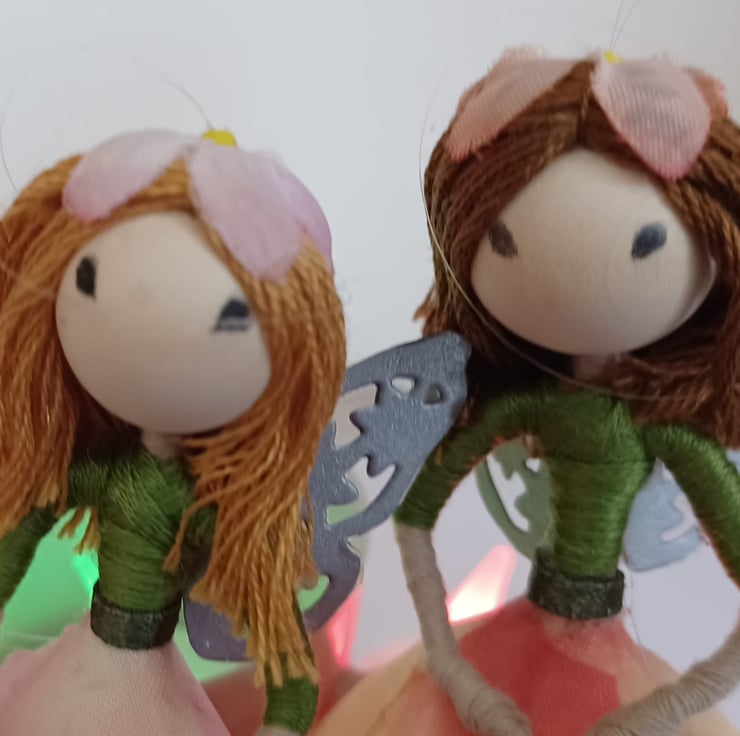 Pat's seasonal fairies are so popular it is rare that they get as far as Folksy before they are snapped up! We have only two left to offer from this summer's batch. Made with a yarn wrapped wire frame and wooden bead head, these are Rose Garden fairies, dressed in their summer finery. An 'invisible' thread loop from the crown of the head allows them to hang. Not toys - these are strictly ornaments - and we can't guarantee they'll be able to grant all your wishes, but we're sure they'll try their very best!