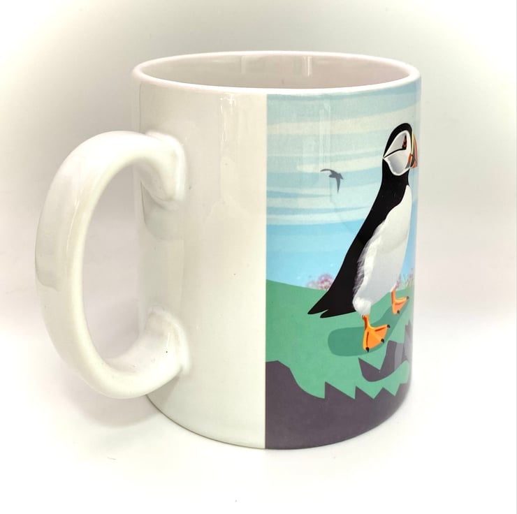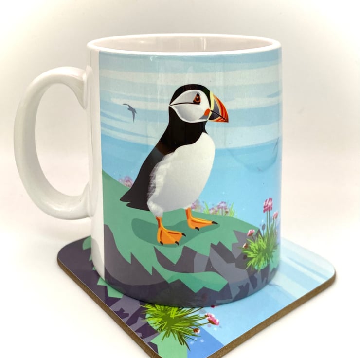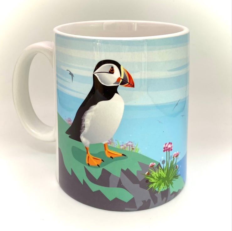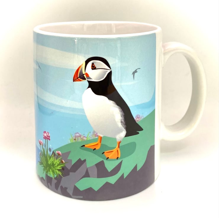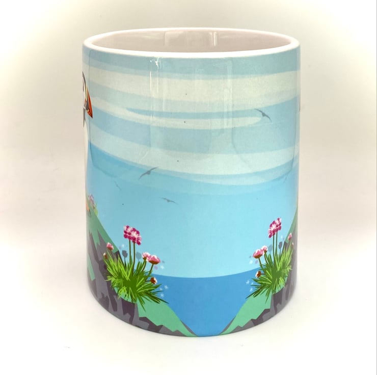 A cute little puffin gazes out to sea, surrounded by pretty pink sea thrift - my original mug illustration created to capture the charm of our coastal wildlife.
