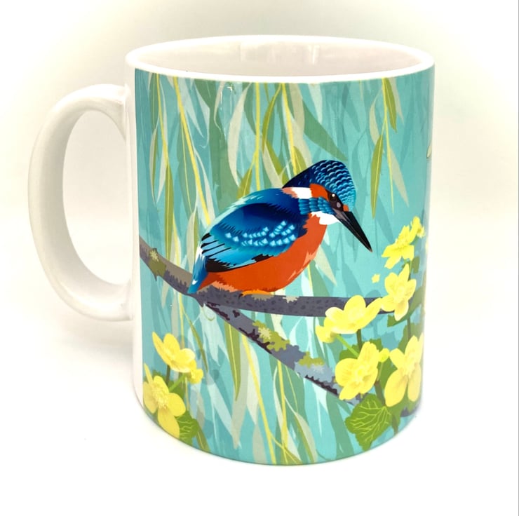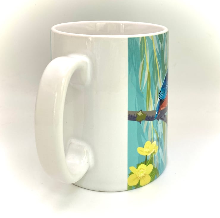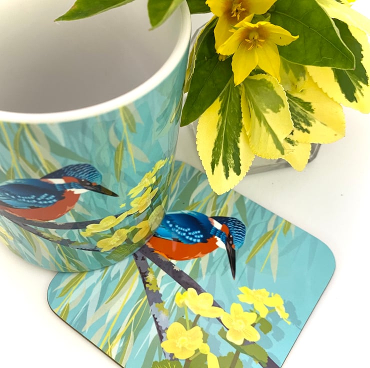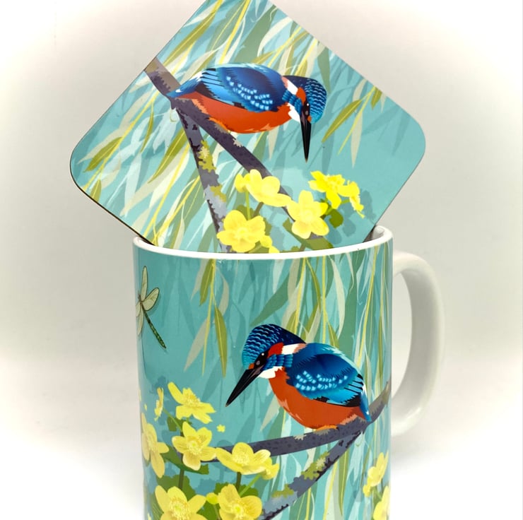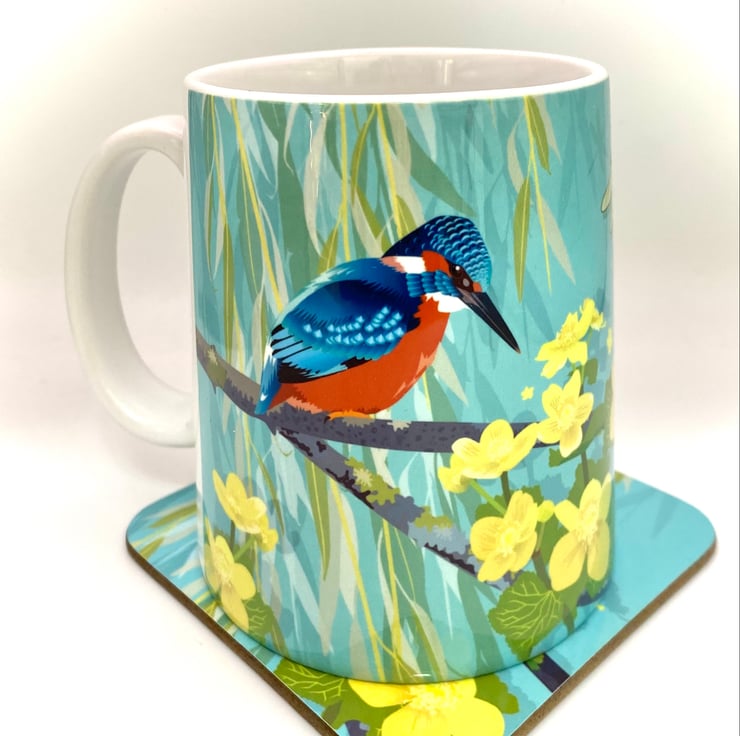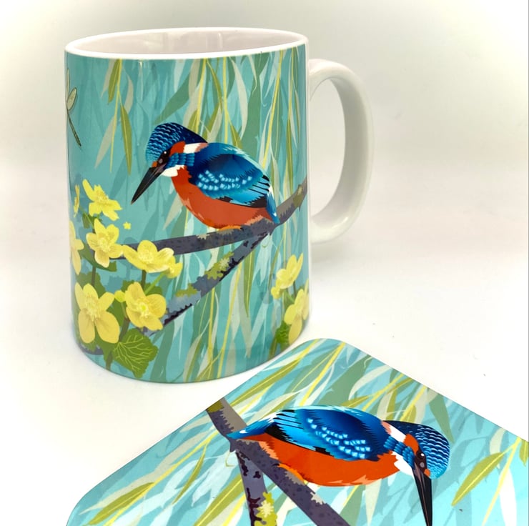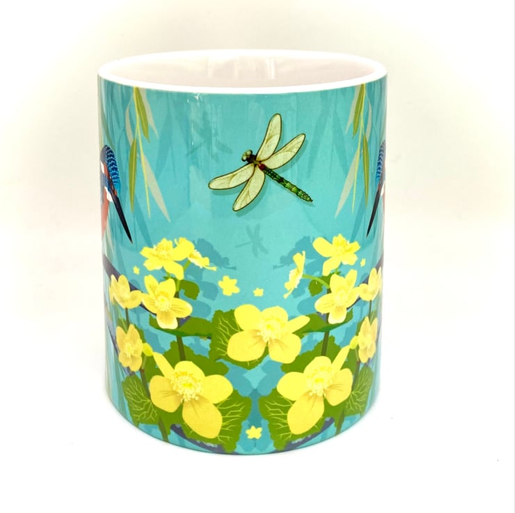 Beautiful Kingfisher sitting perfectly still waiting to catch a fish, next to some pretty yellow Marsh Marigolds and a dragonfly is featured on this chunky 10oz Ceramic Mug with a matching square Hardback Eco Coaster (see options).