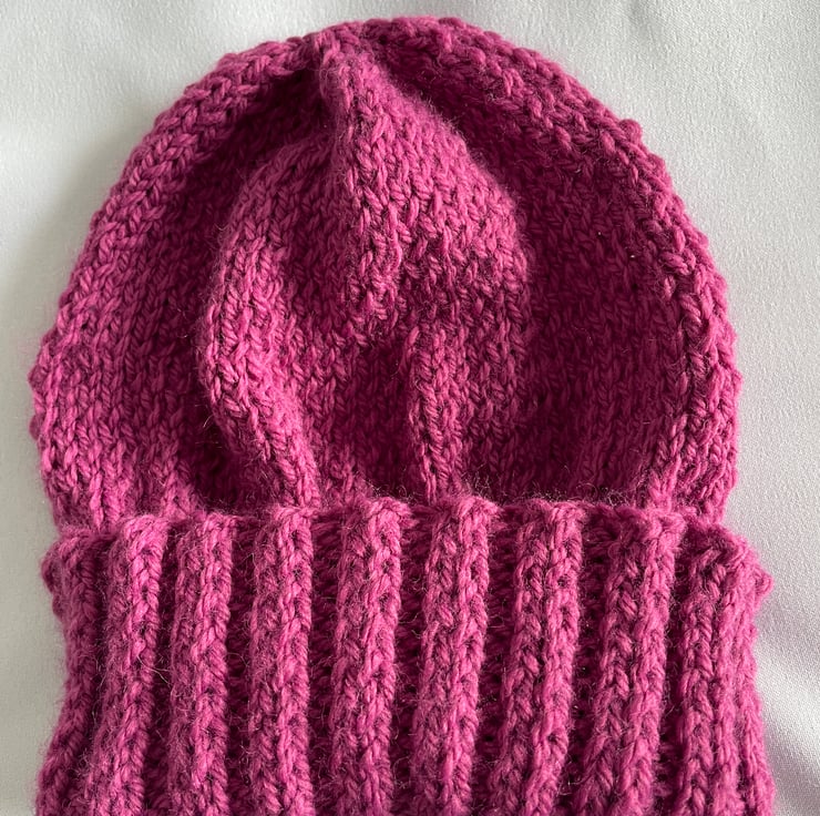 Handknitted pink beanie hat. Adult size. Knitted in soft chunky wool.