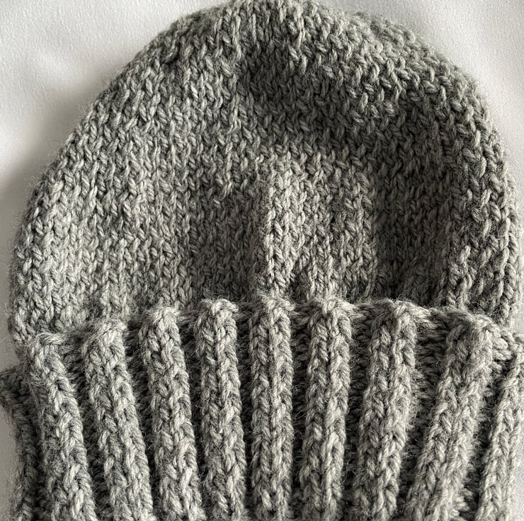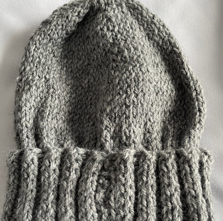Handknitted grey beanie hat. Adult size. Knitted in soft chunky wool.
