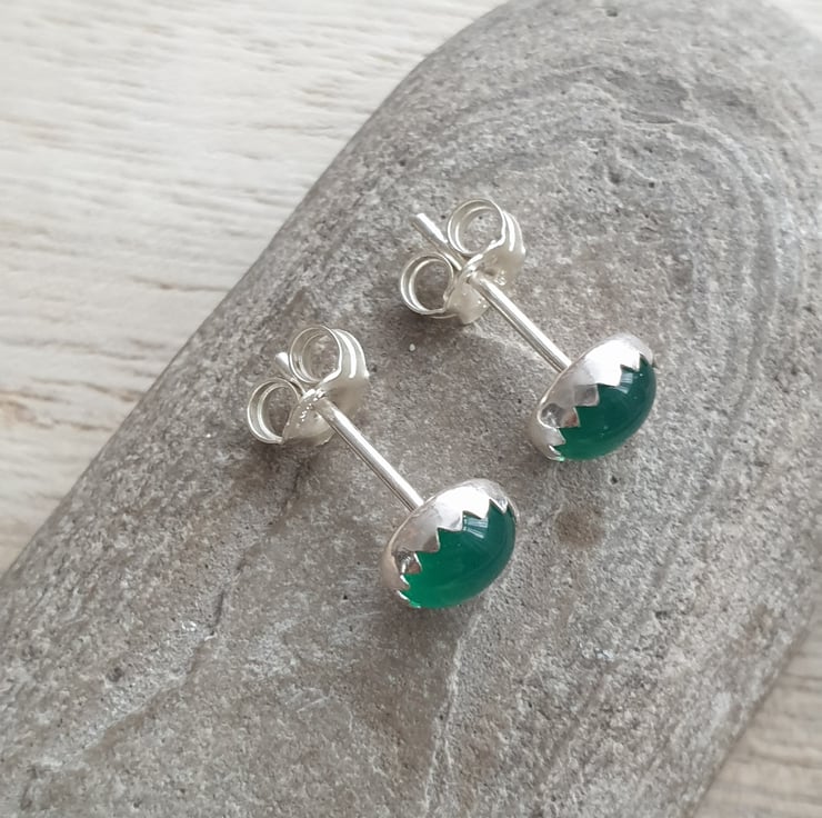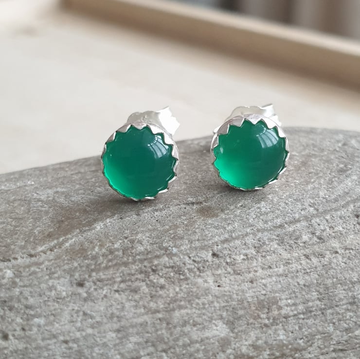 These simple stud earrings are made from sterling silver and feature juicy deep green onyx cabochons. The stones are set in serrated edge bezels for a detailed finish.