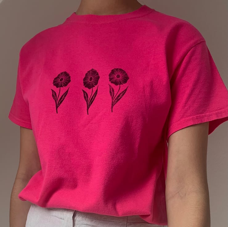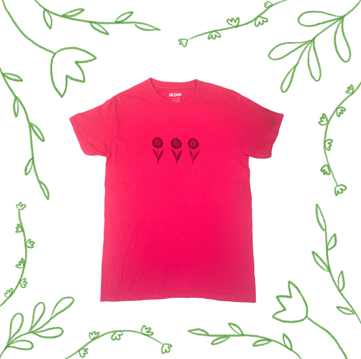 This is a unique hand-printed T-shirt. The T-shirts used to print on have been thrifted and printed on to give them a new lease of life!