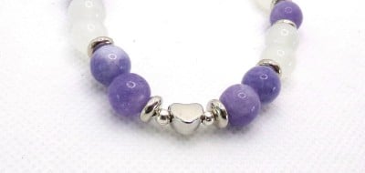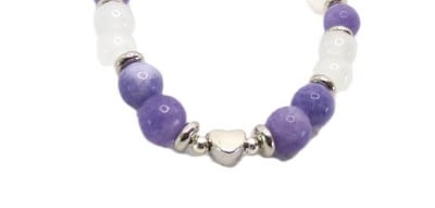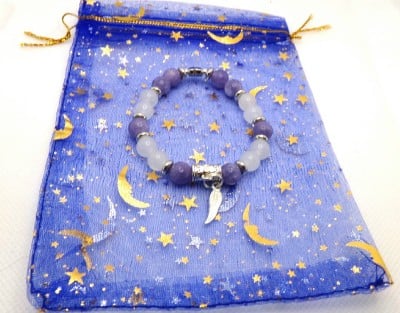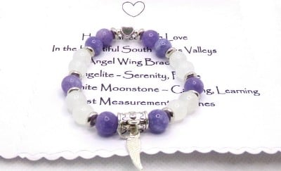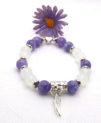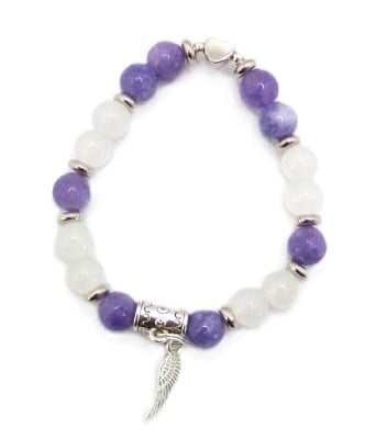 A sweet small bracelet featuring 8mm crystal semi-precious gemstones of Angelite and white Moonstone accented with silver plated spacer beads, and silver plated heart bead and angel wing charm. The beads have been hand strung on strong clear elastic.