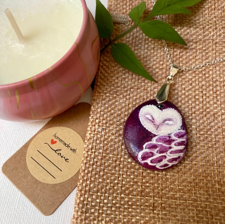 Purple Owlet (Sleepy Baby Owl) Hand Painted Drilled Stone Pendant Necklace with Silver fittings
