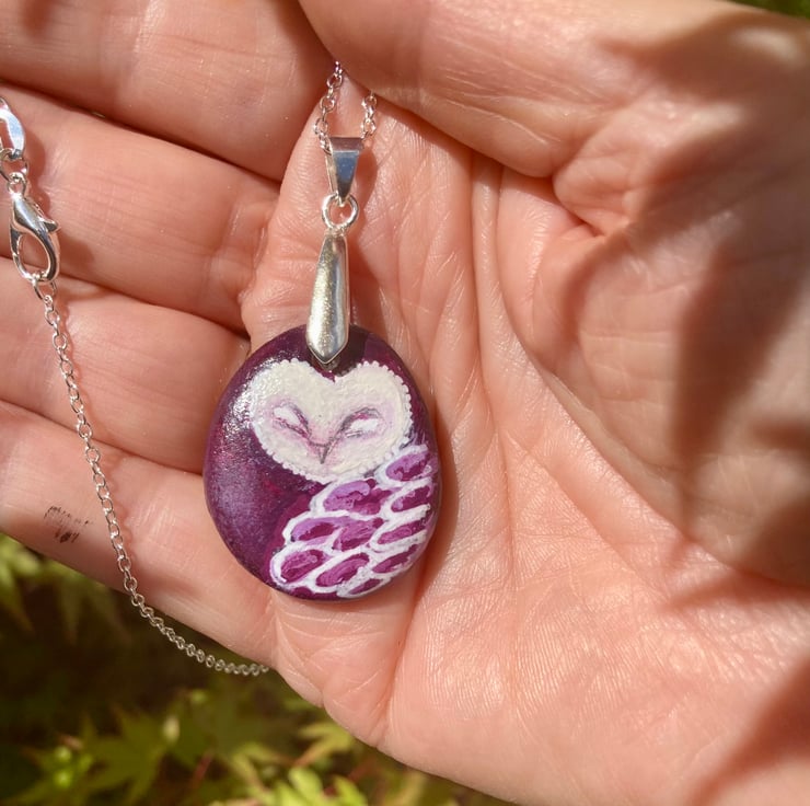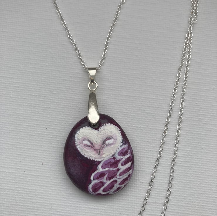 This listing is for a cute hand painted purple baby owl, he has been painted on a small teardrop shaped natural drilled stone. This is fitted with a sterling silver plated bale