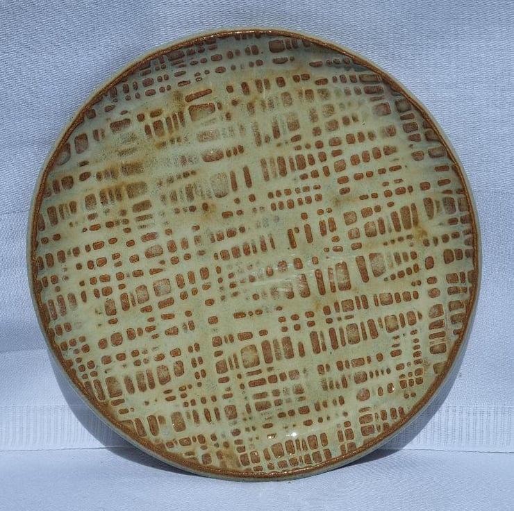 Small textured ceramic plate featuring a beautiful neutral glaze that breaks in to beige and brown. The texture is a modern linear grid design offering something unique and different. The plate is both functional and decorative and would fit in many decors. Lovely blend of colour that is relaxing and lovely to look at. Diameter approx 5.75".