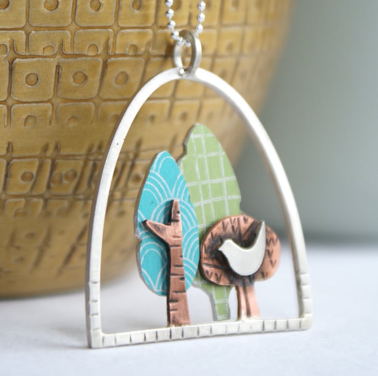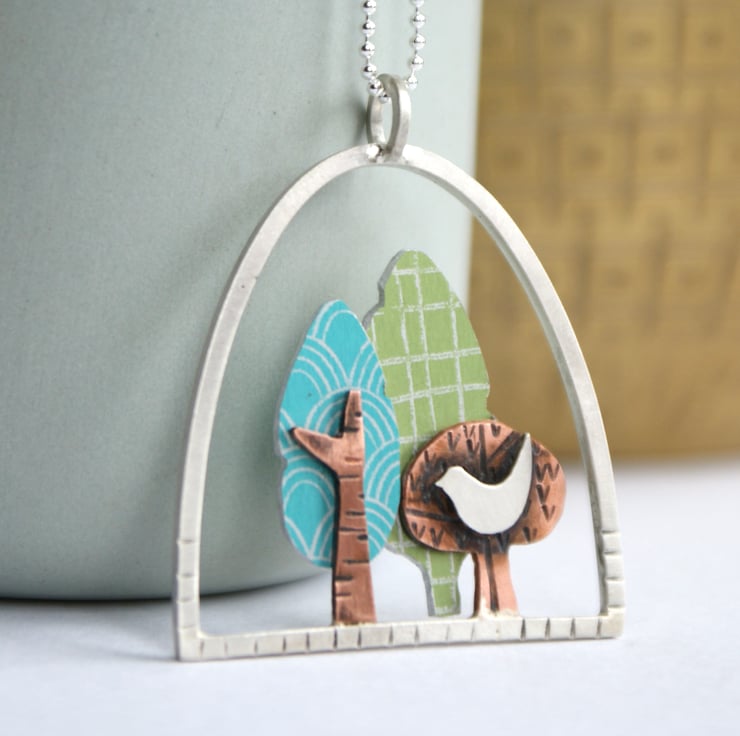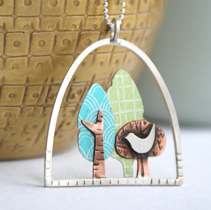 Remind yourself of walks in the woods with this piece of wearable art. The necklace features 3 trees with a little silver bird set within a sterling silver arch. The trees are constructed from silver, copper and aluminium (the coloured parts) and have all been hand cut and assembled with hidden rivets. The metal has been textured, oxidised and partly rubbed back for depth. The pendant is hung from an 18 inch sterling silver chain.