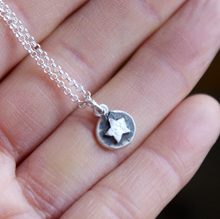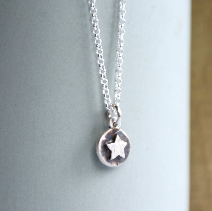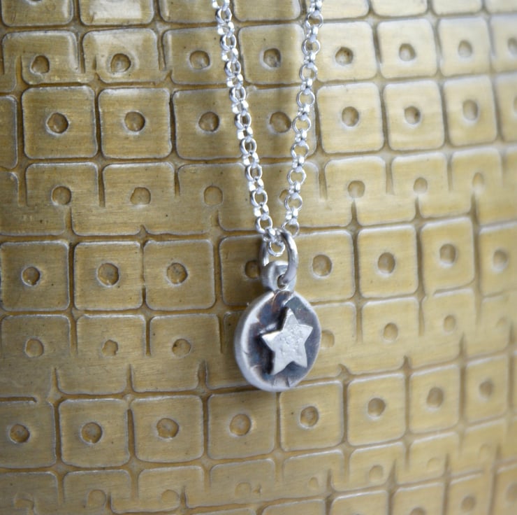 Perfect for the star gazer in your life this tiny pendant has been handcrafted from recycled sterling silver. Its textured pebble shape features a little hand cut textured star. The background is oxidised to a dark grey for contrast. This is hung from an 18 inch sterling silver chain.