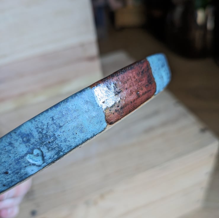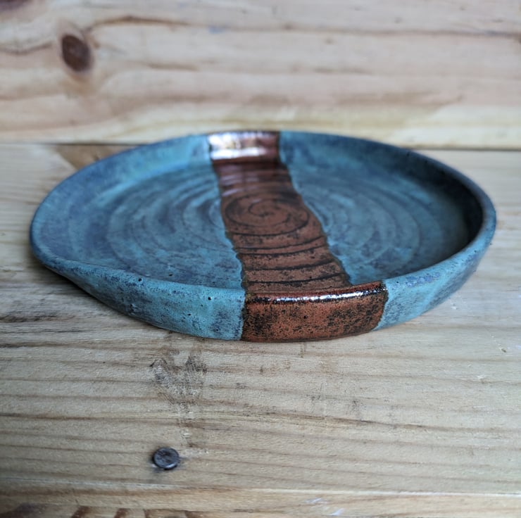 This spoon rest has a slightly dropped lip on one side where your spoon handle rests. A greeny blue matte glaze with a copper strip in a speckled clay which shows some of the speckles once fired. Fired to c1200 degrees (stoneware temperature) which makes things more durable than earthenware.