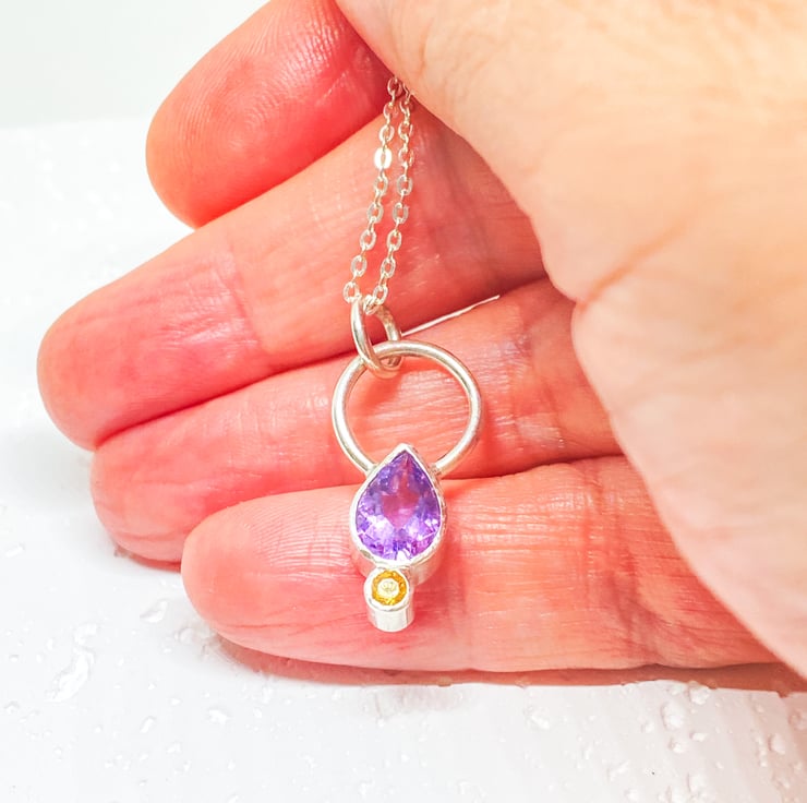 A teardrop amethyst set in sterling silver with a yellow sapphire. Handmade in my home studio using traditional metal smithing techniques.