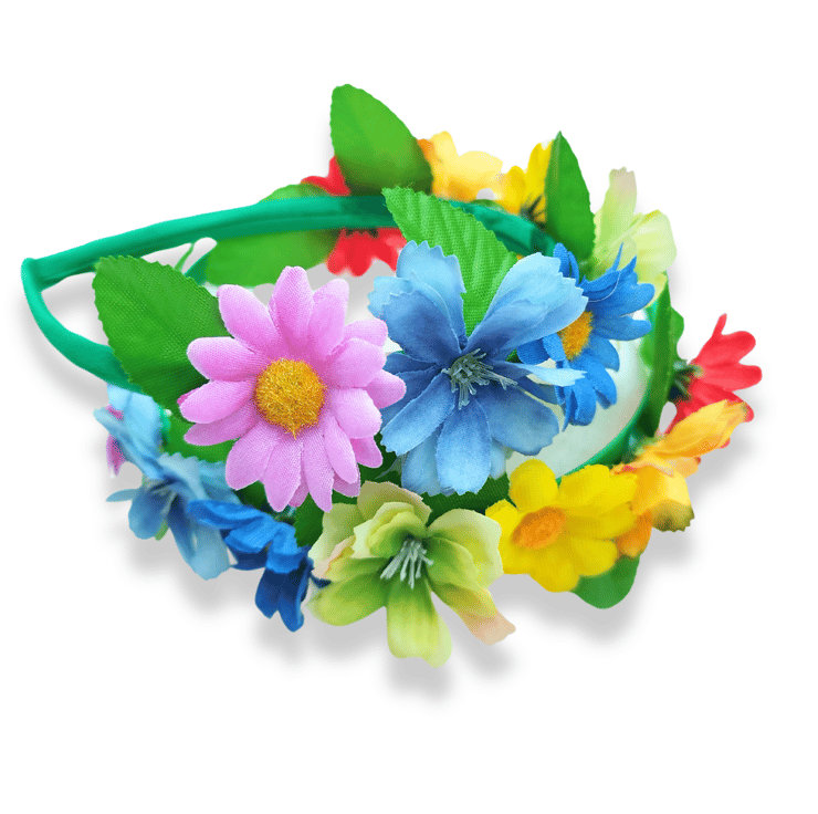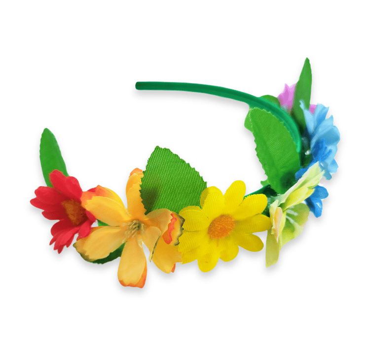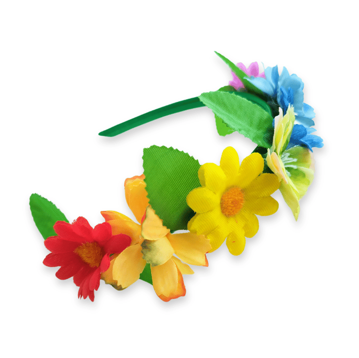 Bring all the rainbow vibes with our fabulous rainbow flower crown! Bright rainbow fabric flowers and leaves are secured onto a soft satin-covered band, making this cute headband perfect for a rainbow wedding, pride costume, or just as a cool accessory. The flexible headband will even fit bigger heads if you want a grown-up version!