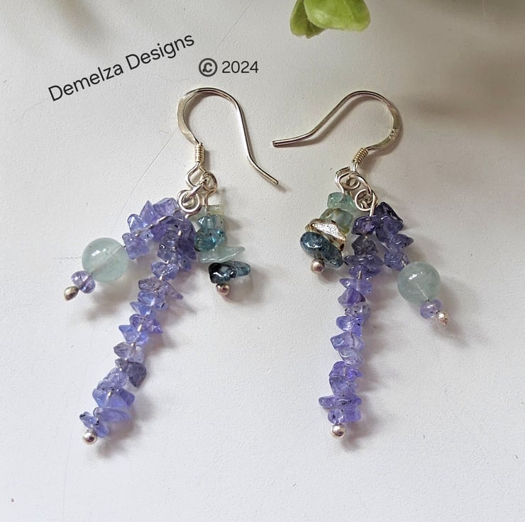 The tanzanite nuggets in these earrings have exceptional colour, which is how tanzanite is valued. The lighter in colour with a grey/light blue appearance are poor quality! The 4mm aquamarine rounds and nuggers compliment the tanzanite beautifully.
