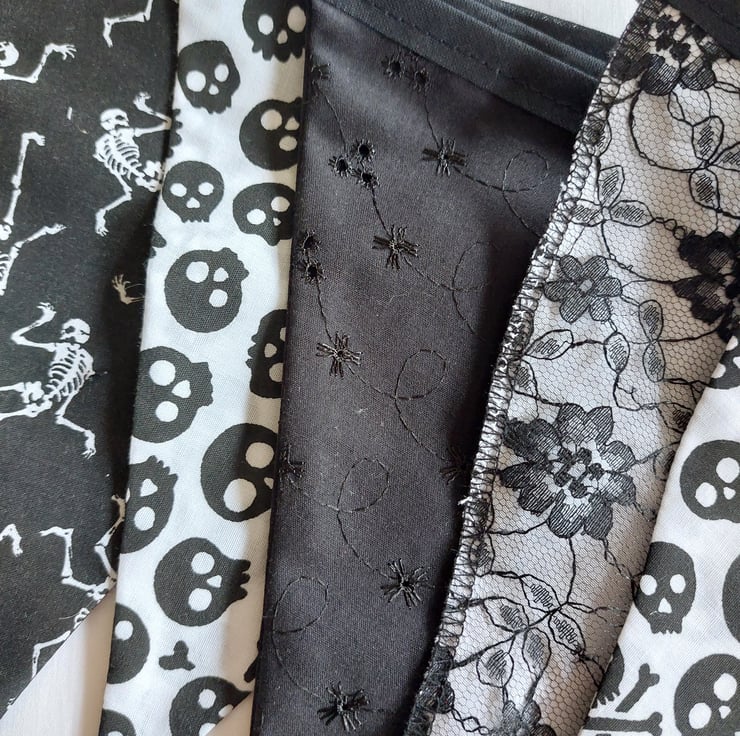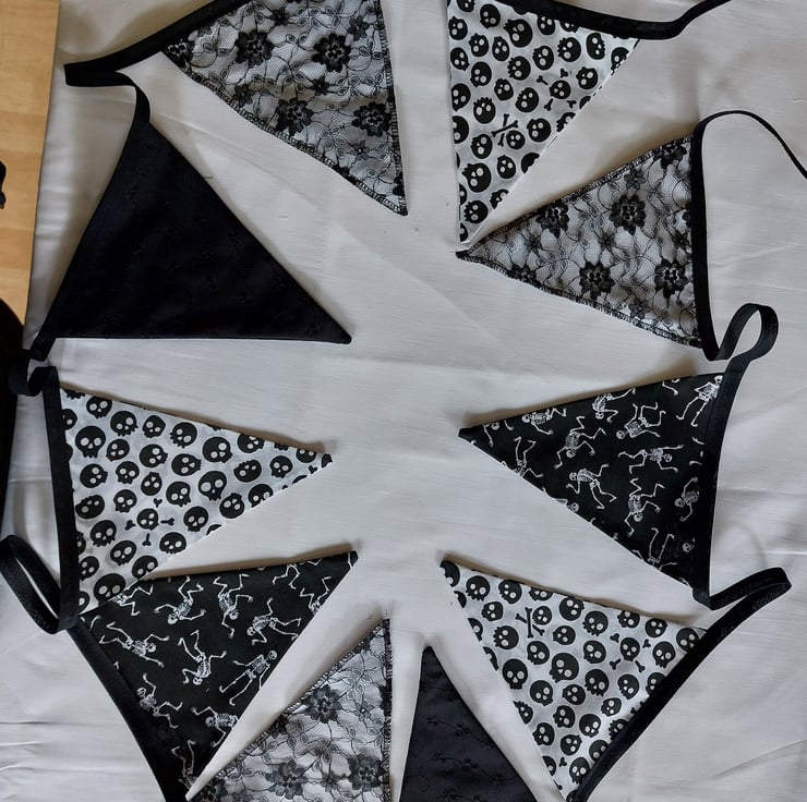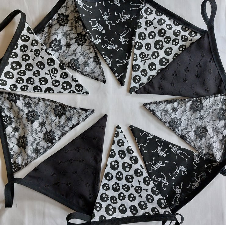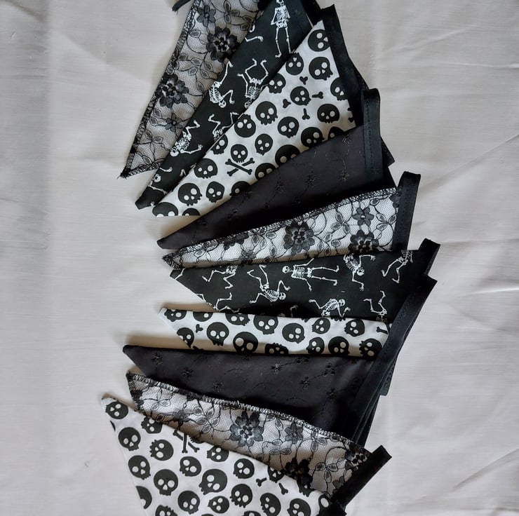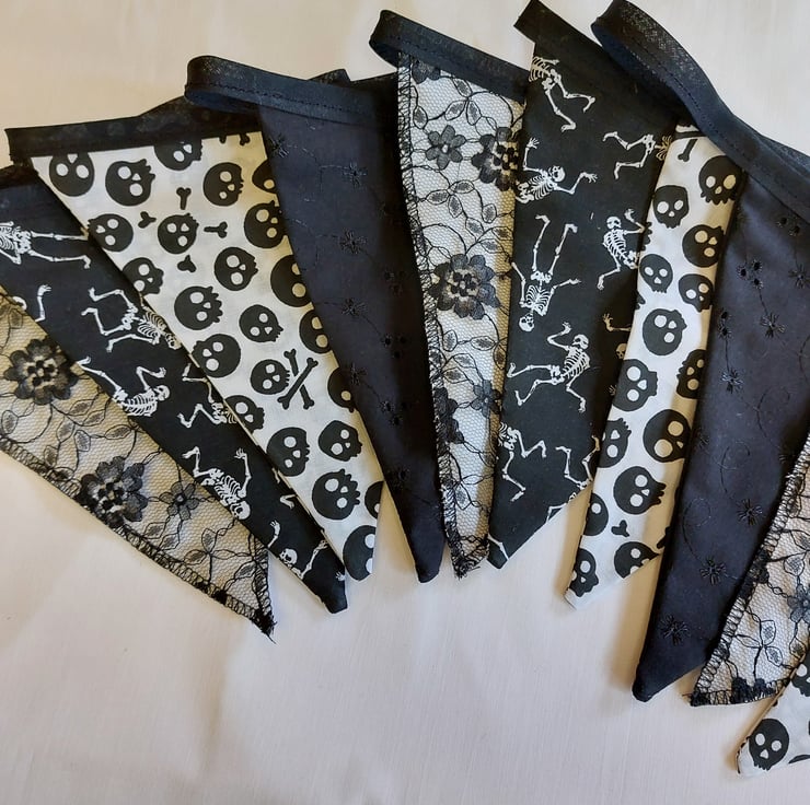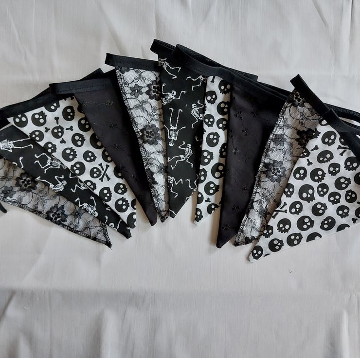 Handmade Gothic style bunting using a mixture of polycotton, lace, cotton and broderie anglaise fabric. Each double sided flag measures 16cm x 20cm, ten flags in total, 3.5 metres in length and stitched to a black bias tape. Extra tape at either end for tying