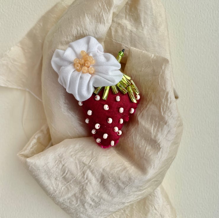 The strawberry has been embroidered through the use of silk fabric, cotton threads and beads as well as featuring a white cotton manipulated flower. Whilst also having a hand sewn metal brooch pin at a size of 2.5 cm’s at the back. The brooches are filled with wadding giving each one a soft cushioned under belly feel.