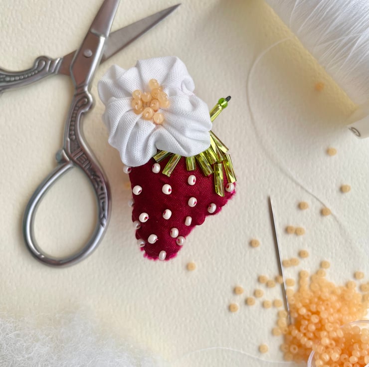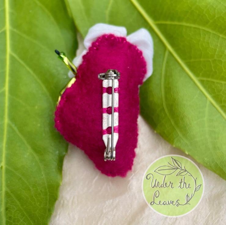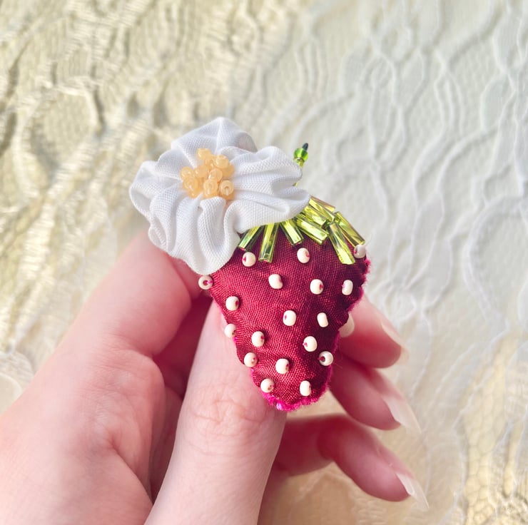 The strawberry has been embroidered through the use of silk fabric, cotton threads and beads as well as featuring a white cotton manipulated flower. Whilst also having a hand sewn metal brooch pin at a size of 2.5 cm’s at the back. The brooches are filled with wadding giving each one a soft cushioned under belly feel.
