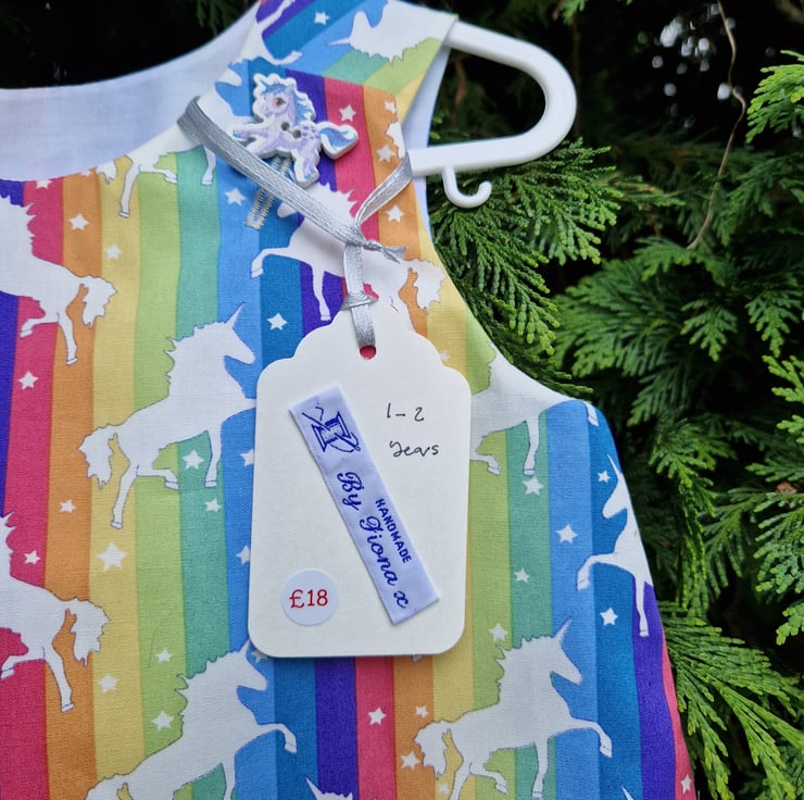 A fully lined pinafore dress. Made from a bright rainbow striped cotton fabric with a print of white unicorns and stars and with wooden unicorn shaped buttons. Can be worn with tights and a T shirt underneath or a cardigan for colder days.