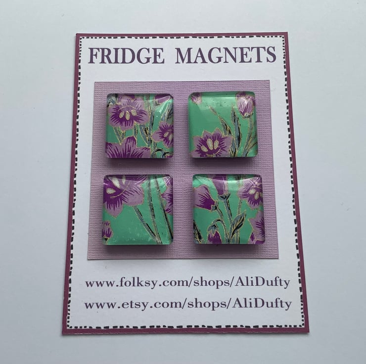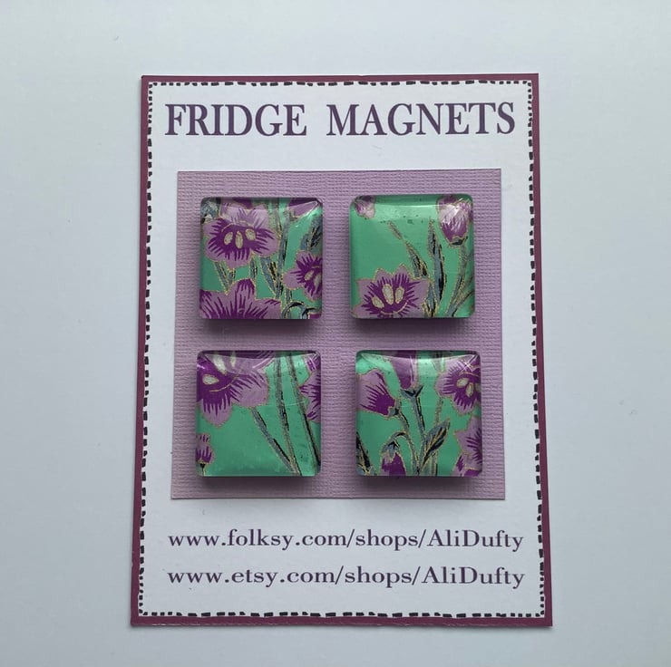I have created this set of 4 refridgerator / noticeboard magnets using gorgeous screen- printed , Japanese yuzen/ chiyogami paper .They have a clear , domed, glass cabochon over them which slightly magnifies the images underneath . There is a strong, thin , neodymium magnet on the reverse side .