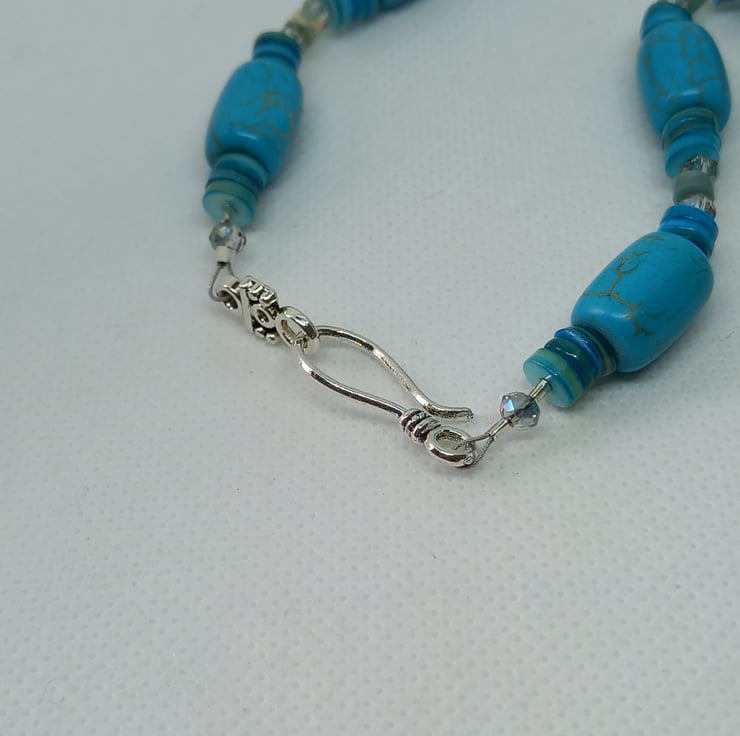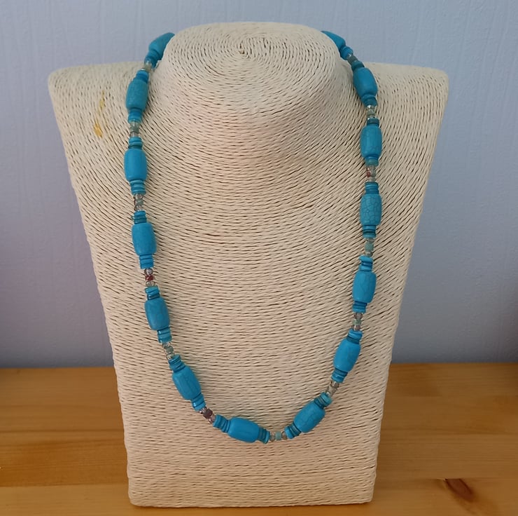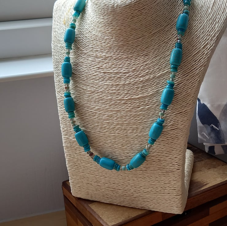 Lots of turquoise and shades of turquoise in this piece. A lovely necklace for summer holidays and so easy to wear.
