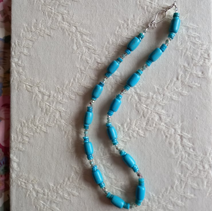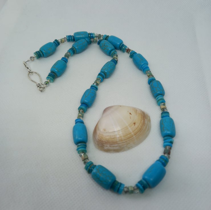 Chunky barrel shaped Howlite beads abound in this cheerful necklace. Simply and securely strung onto 49 strand beading wire which has a lovely fluid feel to it. The howlite beads are accompanied by faux imperial jade circles, turquoise shell discs and small crystal rondelles. There are double crimps at each end to hold everything in place and the necklace fastens with an easy to use silver plated hook.