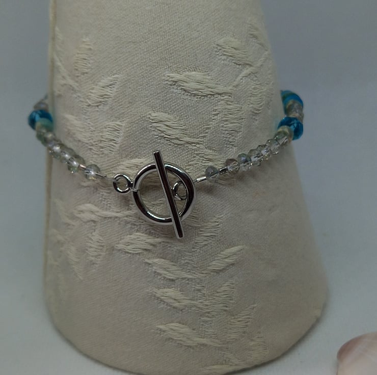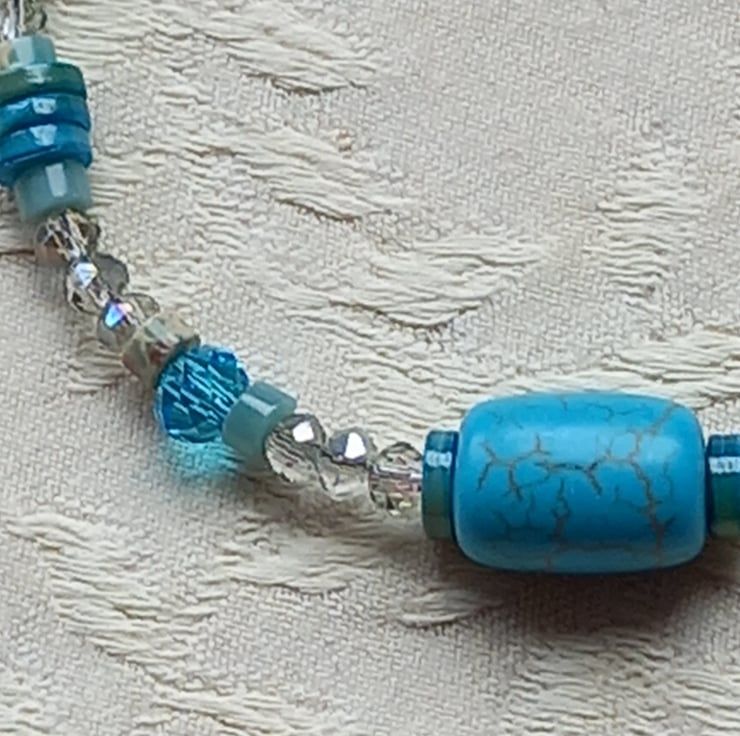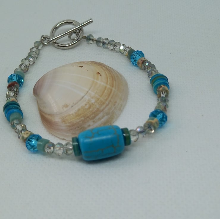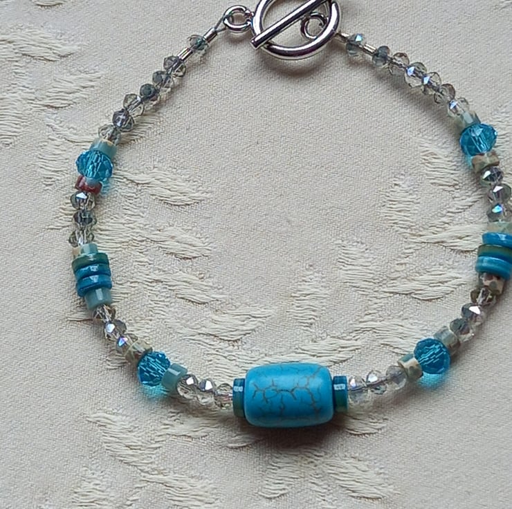 Shades of turquoise and just one chunky feature bead for an easy to wear bracelet you'll wear again and again.